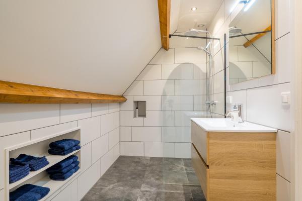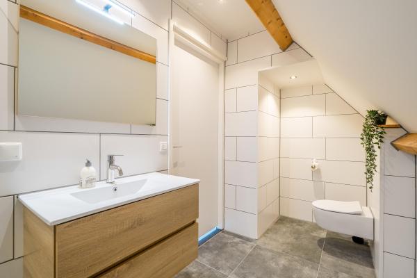 Overloop, 3 slaapkamers, waarvan 2 met inbouwkasten, moderne 2e badkamer uit 2024 met inloopdouche, wastafel en wandcloset.