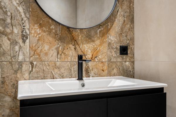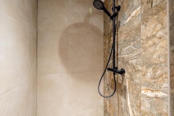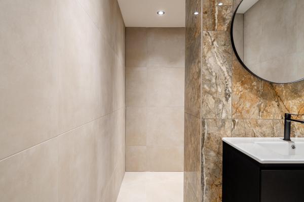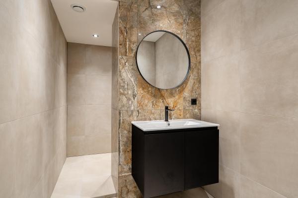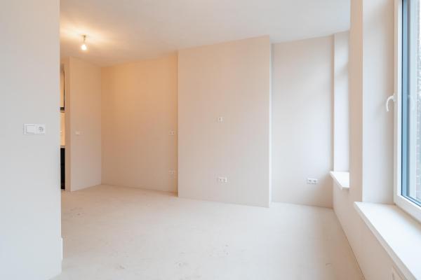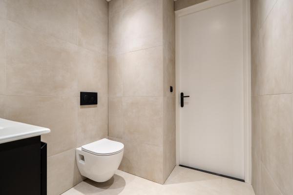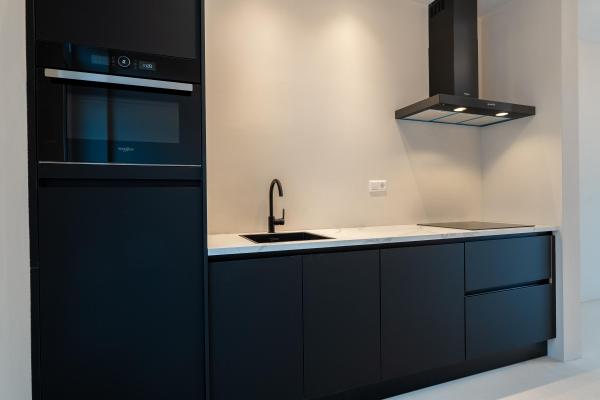 Lichte woonkamer met luxe open keuken en openslaande deuren naar het balkon, luxe badkamer met inloopdouche, wastafelmeubel en wandcloset.