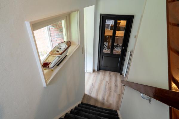Entree/hal, toilet, L-vormige woonkamer van ca. 45 m², tuinkamer met schuifpui naar zonneterras, keuken voorzien van inbouwapparatuur, badkamer voorzien van douche, toilet en wastafel en bijkeuken met doorgang naar inpandige garage; voorzien van zolderberging.