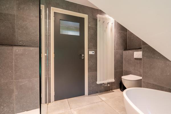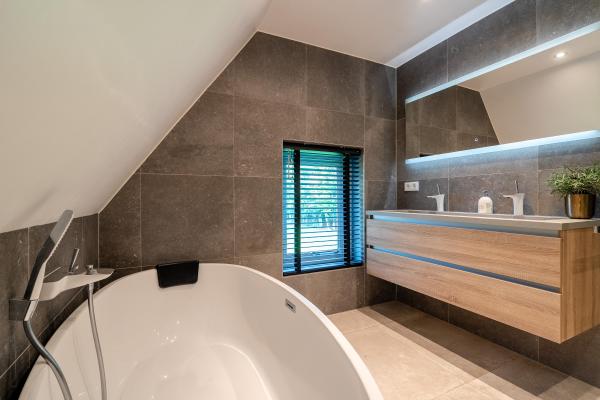 Overloop, vier slaapkamers en moderne badkamer met ligbad, inloopdouche, dubbele wastafel en derde toilet (badkamer voorzien van vloerverwarming).