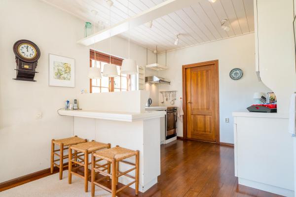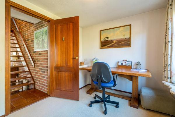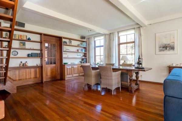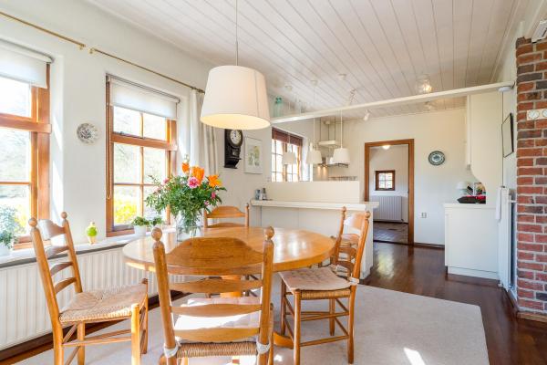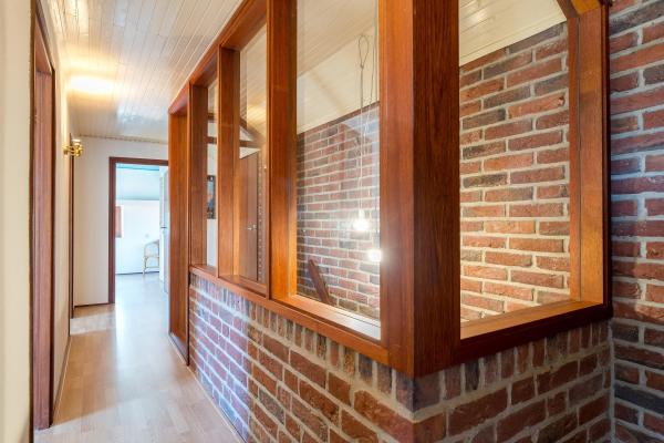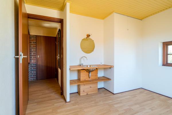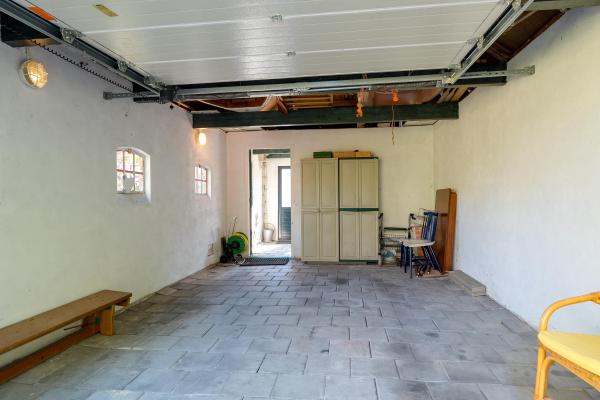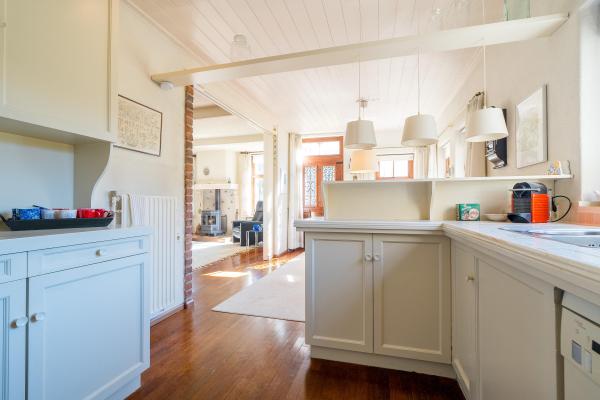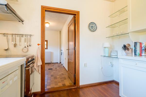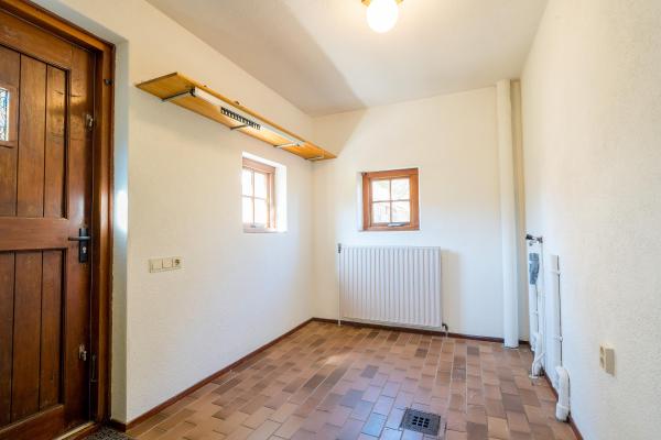 Entree/hal, toilet met fonteintje, ruime lichte woonkamer met houtkachel, eetgedeelte, half open keuken, bijkeuken met spoelbak en toegang naar de kelder en naar buiten, kantoor.