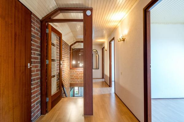 Overloop, 4 slaapkamers, waarvan een met wastafel en een ander met inbouwkasten, badkamer met douche, ligbad, dubbele wastafel, bidet en toilet, bergruimte met o.a. cv-opstelling.