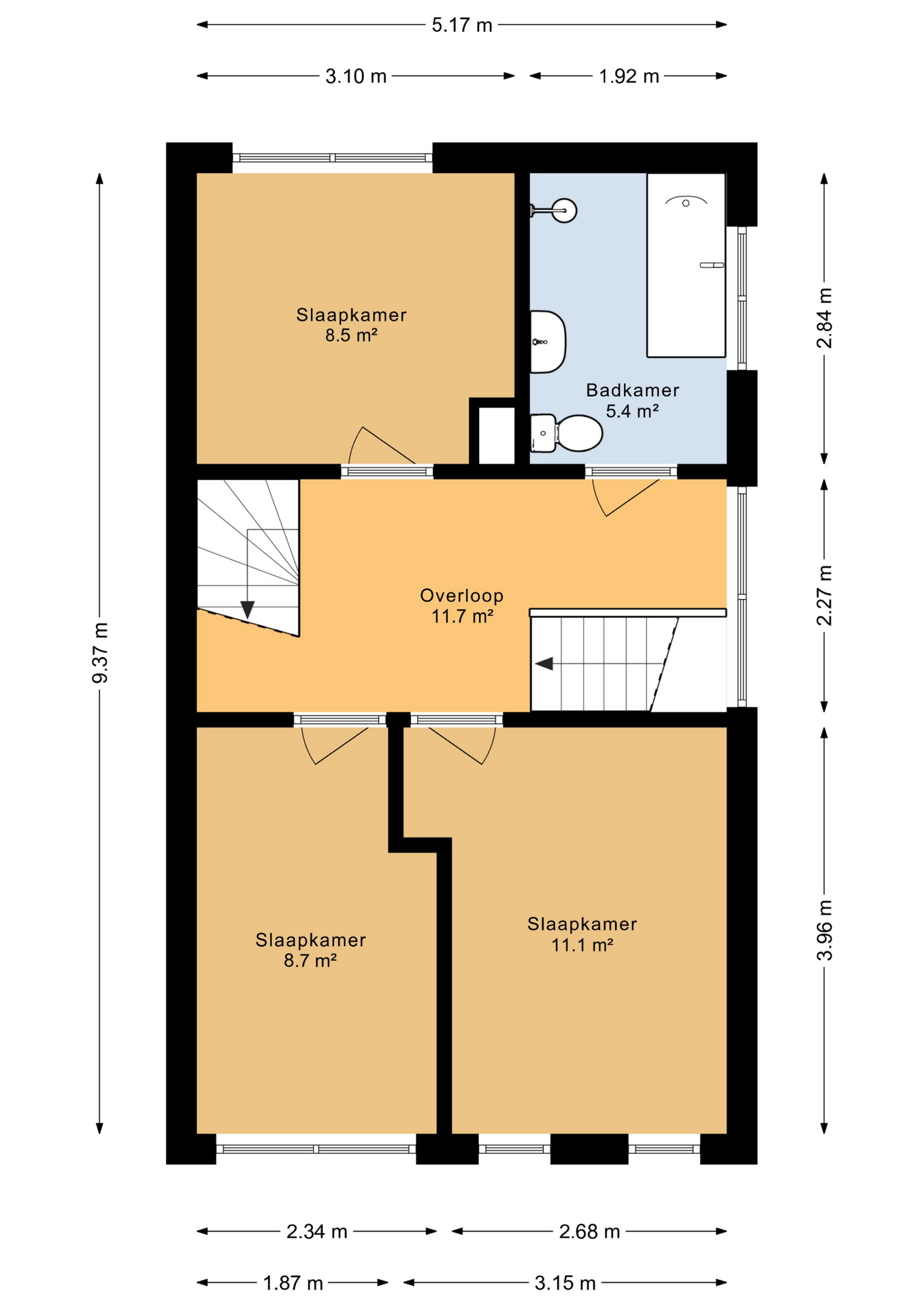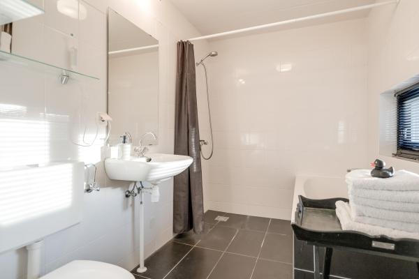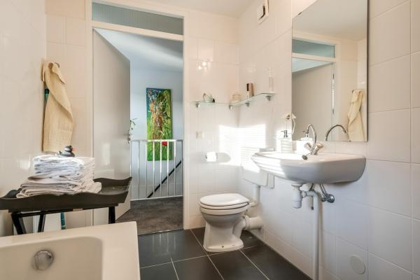Overloop, 3 slaapkamers, moderne badkamer met douche, ligbad, wastafel en toilet.