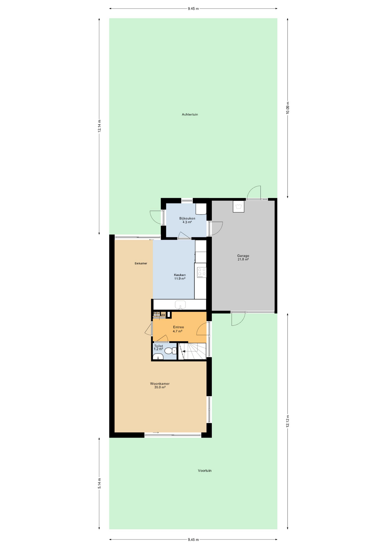Entree/hal met trapopgang, toilet met fonteintje, L-vormige living met moderne open keuken voorzien van diverse inbouwapparatuur. bijkeuken met toegang naar buiten en de garage.