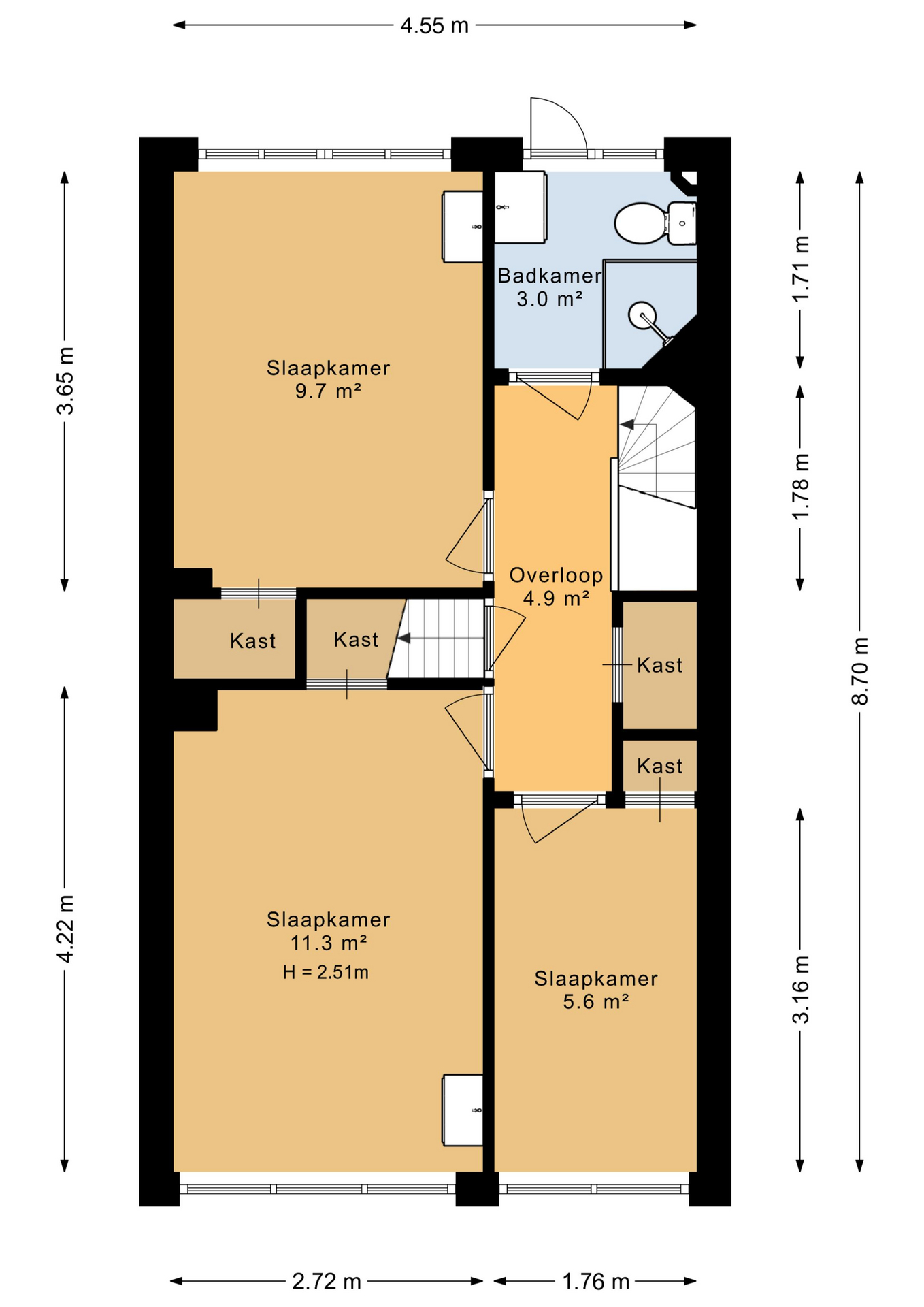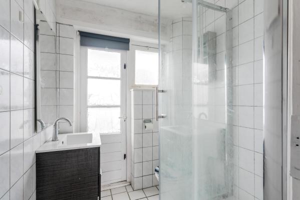 Overloop, 3 slaapkamers, badkamer met douche en wastafel.