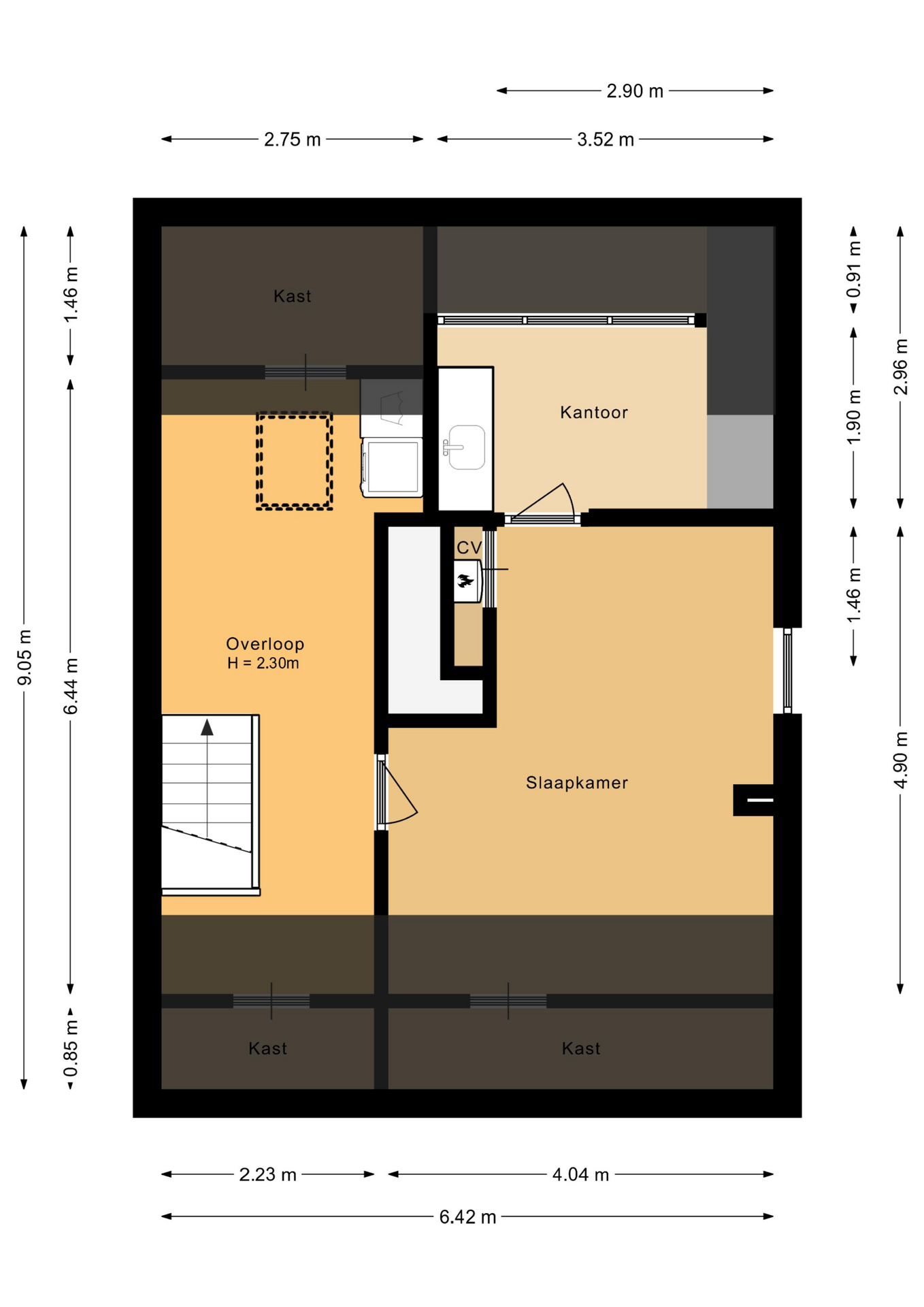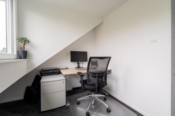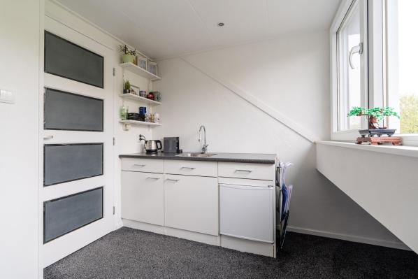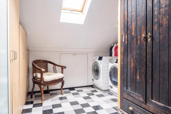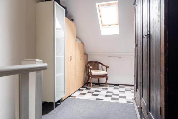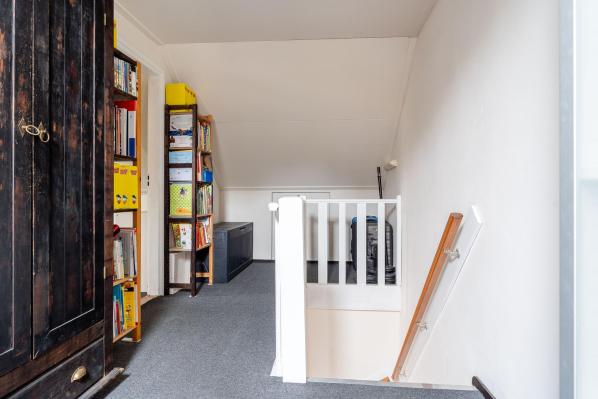 Overloop met witgoedaansluitingen en knieschotten, riante 5e slaapkamer, werkkamer met dakkapel en pantry.