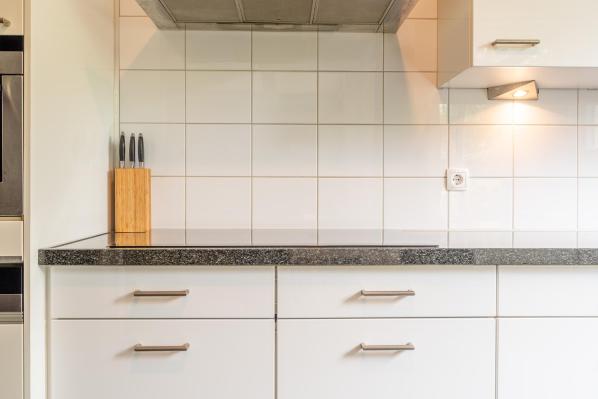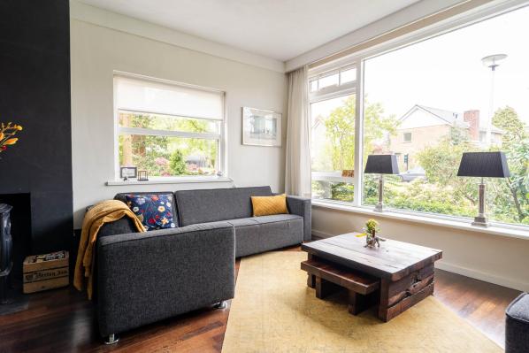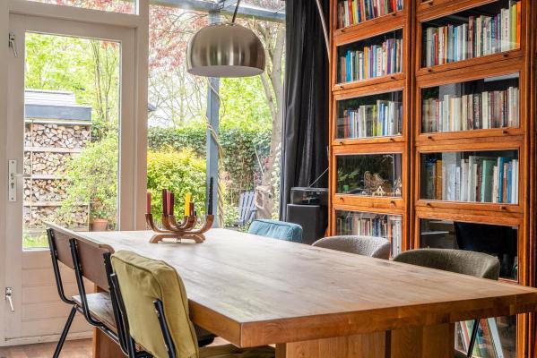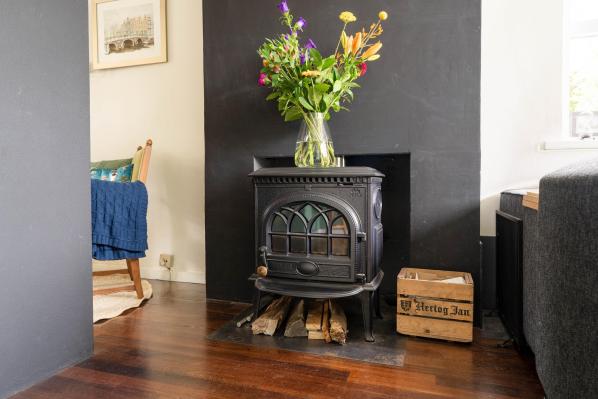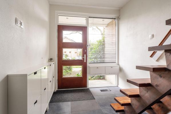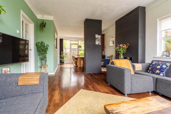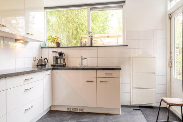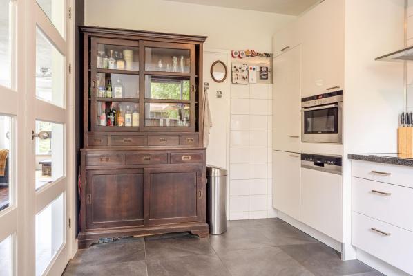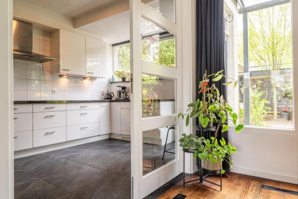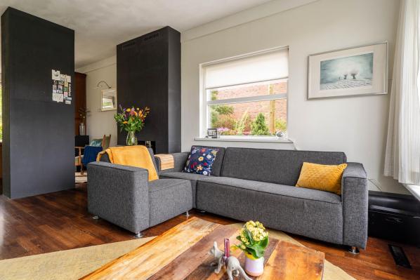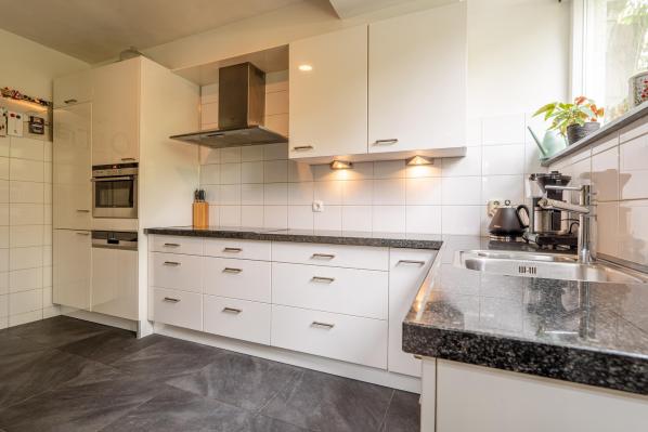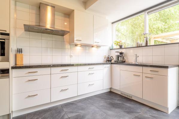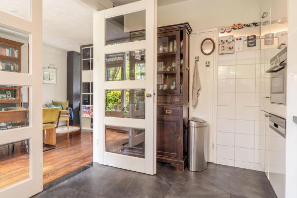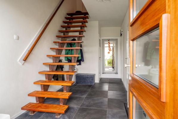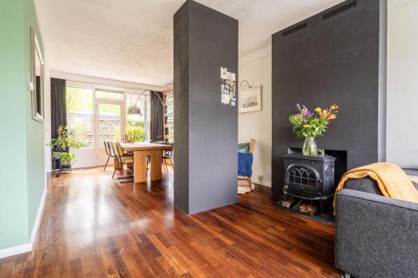 Entree/ruime hal met trapopgang, toilet met fonteintje (2022), lichte woonkamer met houtkachel en toegang tot de achtertuin, moderne keuken voorzien van diverse inbouwapparatuur.