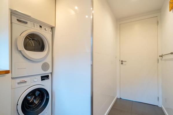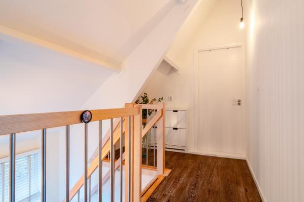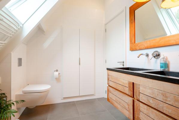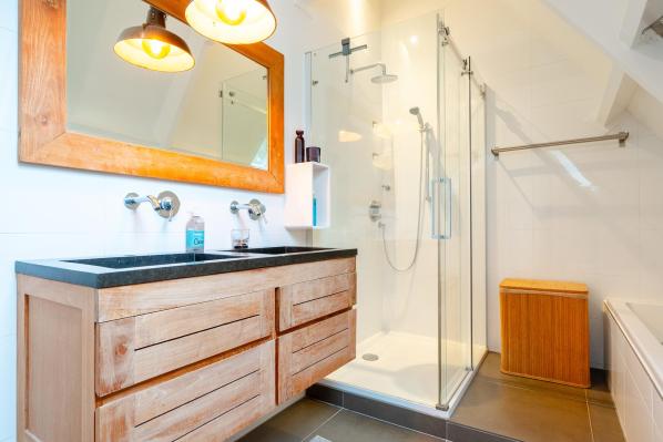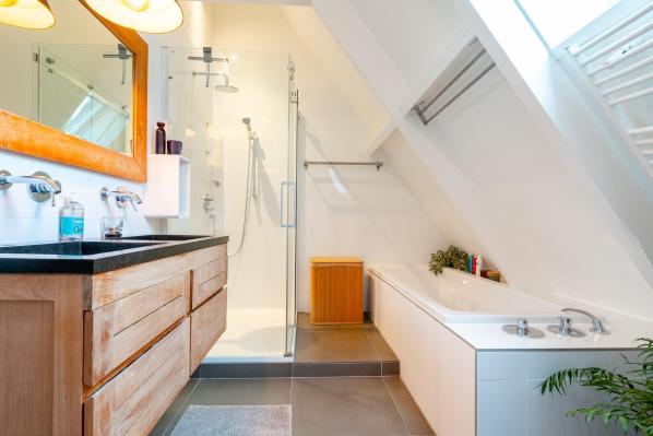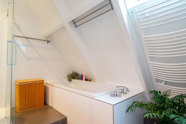 Overloop, 3 slaapkamers, moderne badkamer met douche, ligbad, wastafelmeubel met 2 kranen en wandcloset.