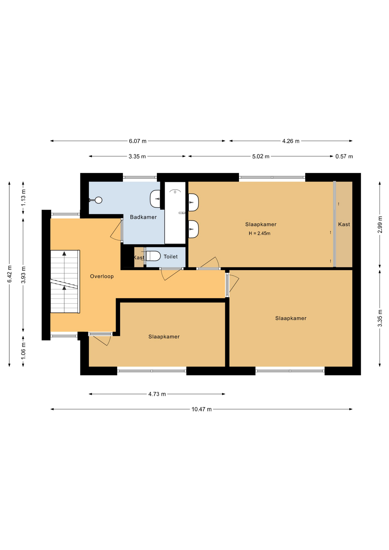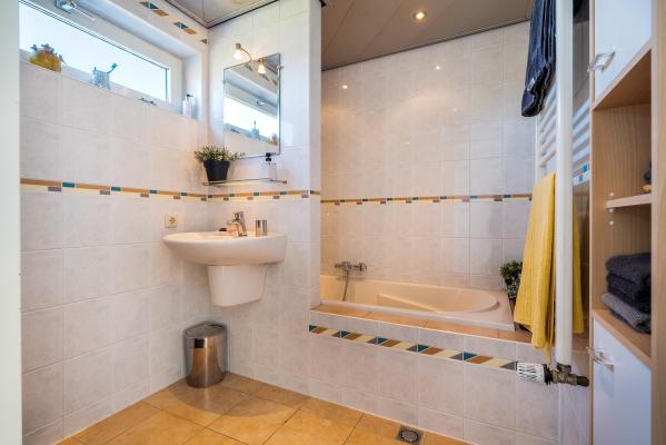 Ruime overloop, 3 slaapkamers, badkamer met douche, ligbad en wastafel.