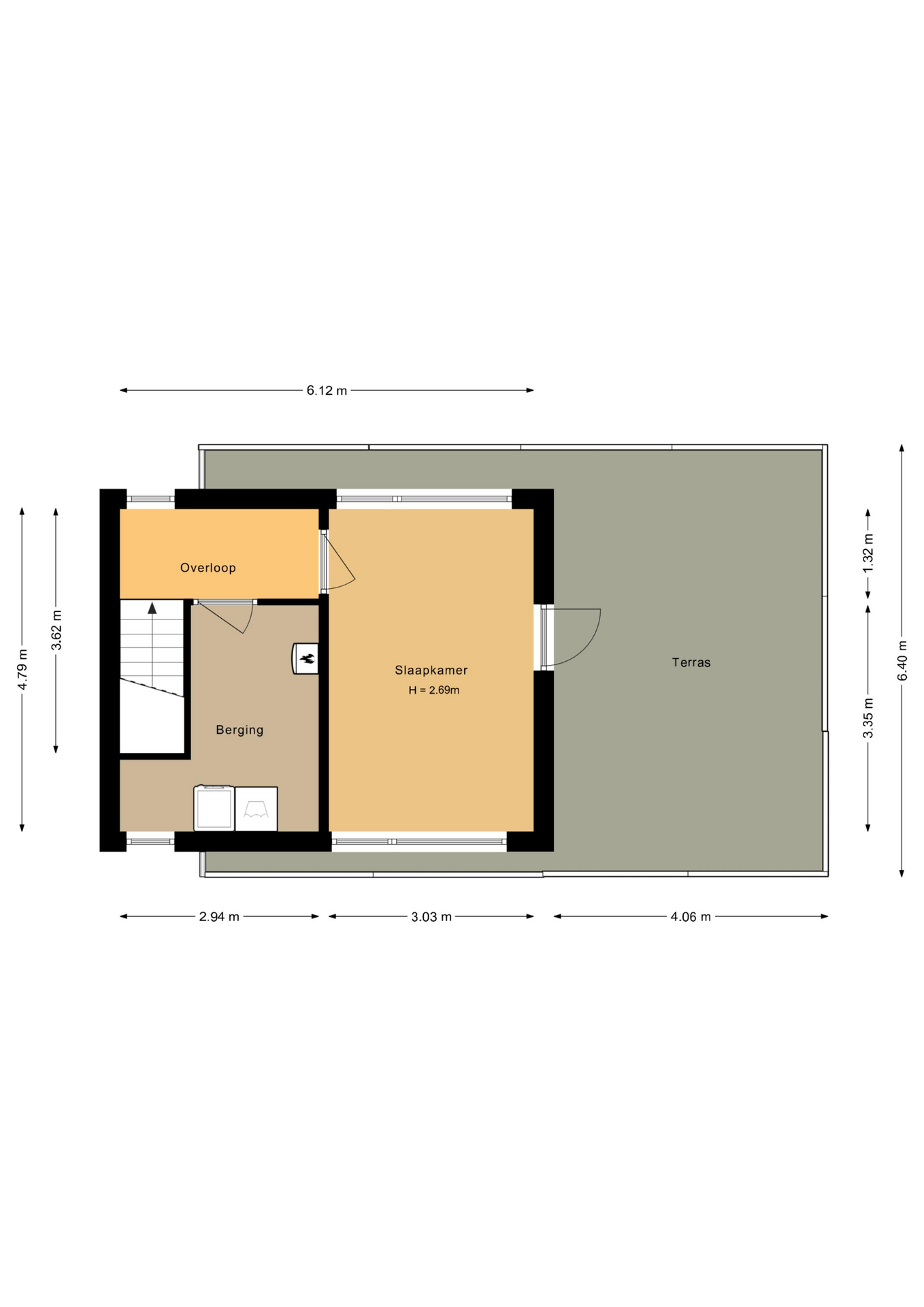 Overloop, was-, stook- en bergruimte, 4e ruime slaapkamer met toegang tot het dakterras.