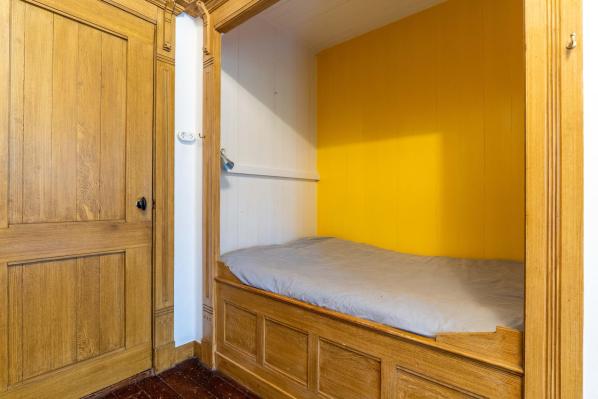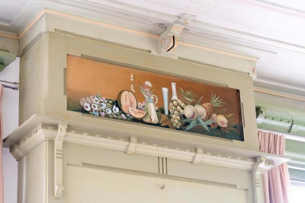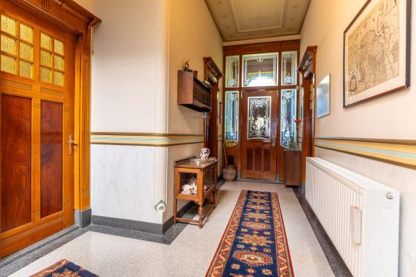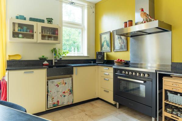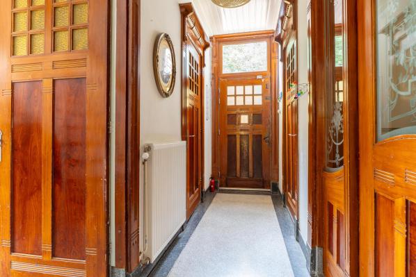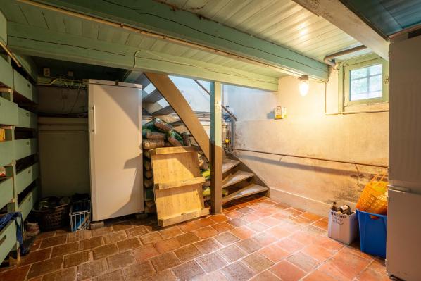 Entree met tochtportaal, centrale hal die overgaat in het trappenhuis met stijlvolle bordestrap, lichte, sfeervolle woonkamer met een bijzondere en karakteristiek gebogen erkerkozijn aan de voorzijde en een houtkachel als bij- en sfeerverwarming, woonkeuken van ca. 23 m² met sfeervolle keukeninrichting (natuurstenen aanrechtblad en enige inbouwapparatuur) en dubbele tuindeuren met toegang naar terras, werk-/slaapkamer (voormalige zomerwoonkamer) ca. 24 m², slaapkamer ca. 15 m², zijgang naar buitendeur, toilet, mooie gave droge kelder (ca. 18 m2) met stahoogte, 2e entree/hal met badkamer en opgang naar verdieping in het voormalig koetshuis welke verbouwd is tot slaap-/speelzolder.