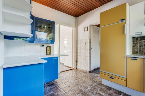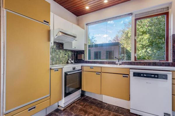 Ruime entree met fraaie hal, trapopgang, garderobe en toilet. Royale living met twee erkers, schouw en openslaande deuren naar de tuin. Lichte keuken met toegang tot de bijkeuken met aansluitingen voor wasmachine en droger, en directe doorgang naar de garage. Vanuit de hal toegang tot de provisiekelder (ca. 8,5 m³).