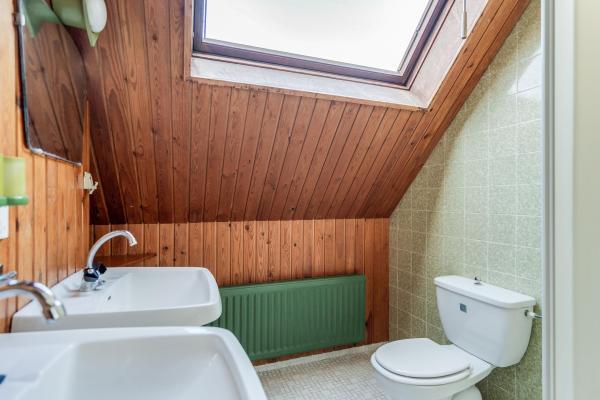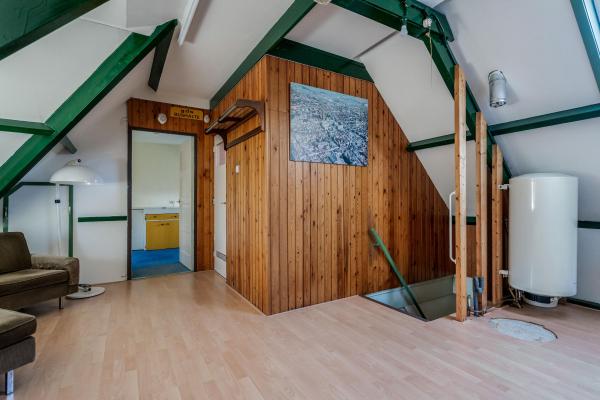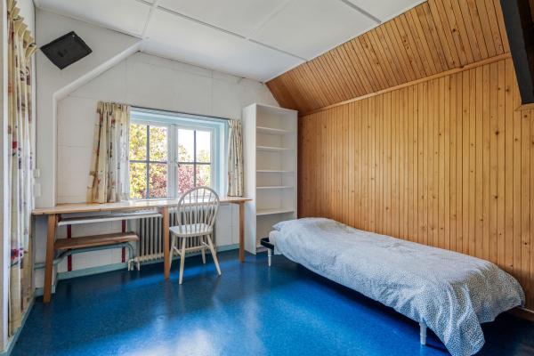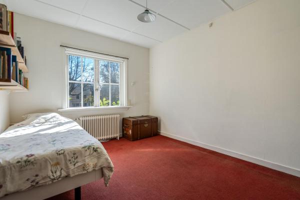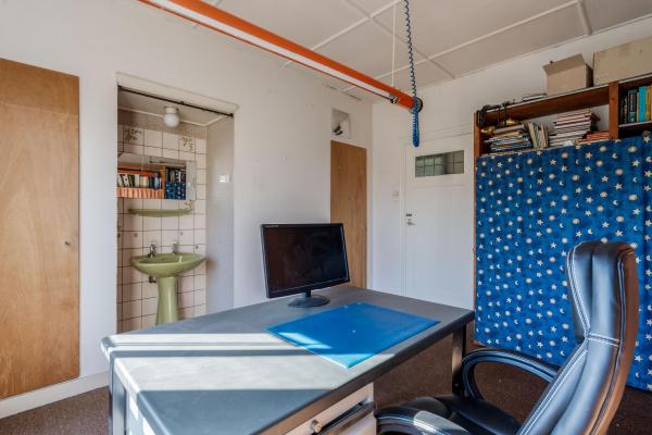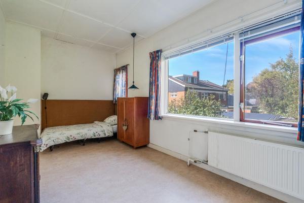 Royale overloop en twee ruime slaapkamers, beide met wastafel. Badkamer. Royale extra bergruimte en mogelijkheid voor werk- of hobbyruimte.