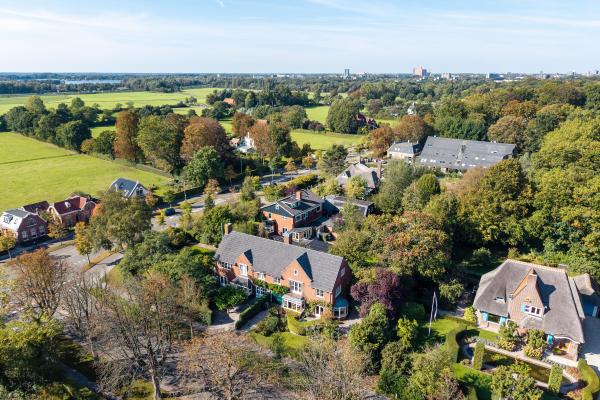 Op een fraaie locatie, waar de Rijksstraatweg en de Dilgtweg elkaar kruisen, staat dit karakteristieke en royale herenhuis. Een markante blikvanger op de stabiele zandgrond van de Hondsrug met de tijdloze allure en charme van de jaren ’30.Het huis ademt sfeer en authenticiteit. Originele details en harmonieuze verhoudingen maken de historie voelbaar. De royale living met twee erkers en openslaande deuren naar de tuin vormt het hart van de woning, waar licht en ruimte samenkomen. De aangrenzende lichte keuken met uitzicht op de tuin, en verbonden met een praktische bijkeuken en garage, nodigt uit tot samen koken en tafelen. Onder het huis bevindt zich een provisiekelder. Op de verdiepingen bevinden zich maar liefst zes ruime slaapkamers, elk met eigen wastafels met warm en koud water en twee badkamers. De tweede verdieping biedt volop ruimte voor logees, werken aan huis of het creëren van speel- of hobbyruimte. De beschutte en fraai onderhouden tuin rondom het huis biedt diverse fijne zitplekken om te genieten van rust, groen en buitenlucht. Er is een grote vrijstaande (fietsen)berging en een oprit met plaats voor twee auto’s, met directe toegang tot de garage.