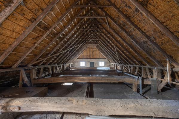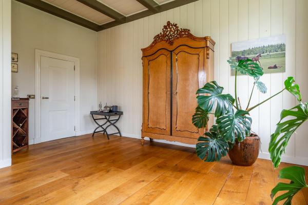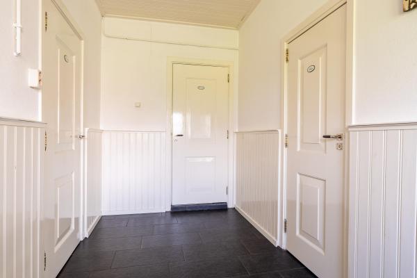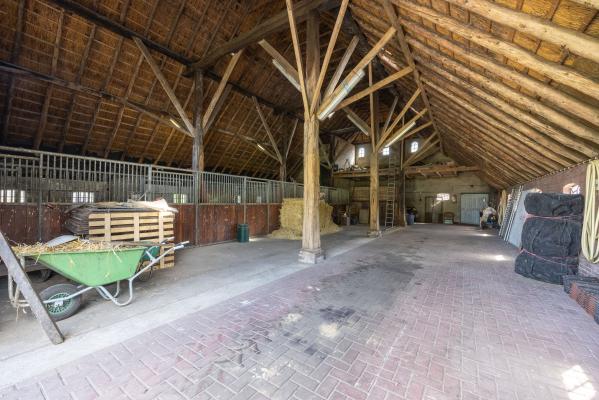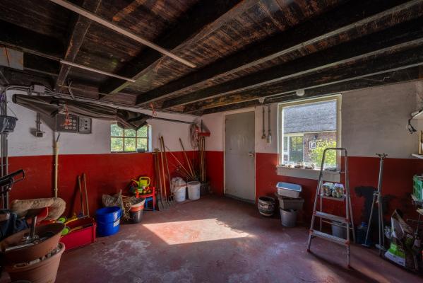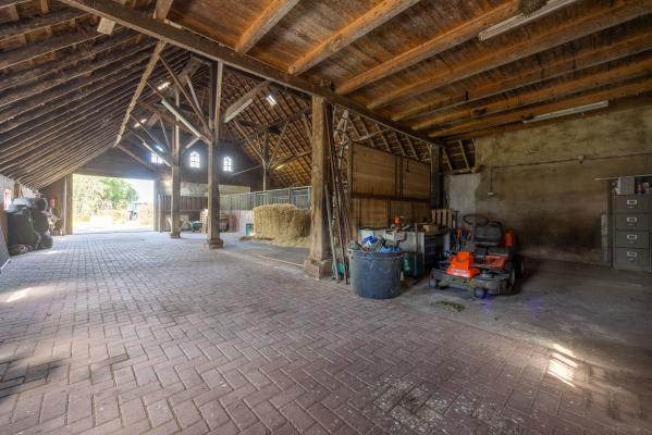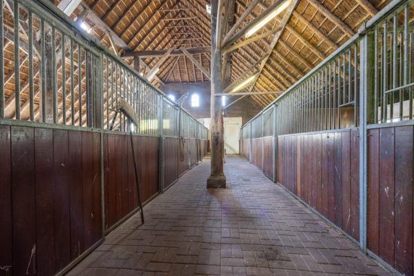 De entree naar de berging is de meest logische weg die toegang geeft tot de rest van de schuur. Vanhier uit betreedt men de gang tussen de 8 paardenboxen met eigen uitloop naar buiten en is ook de overige schuurruimte bereikbaar met aan de achterzijde de baander naar het achtererf. Deze grote schuur van 266m² is voor vele doelen inzetbaar. De paardenboxen zijn indien gewenst makkelijk demonteerbaar.