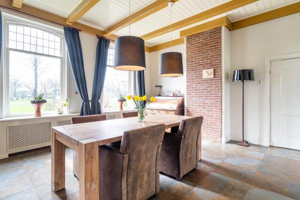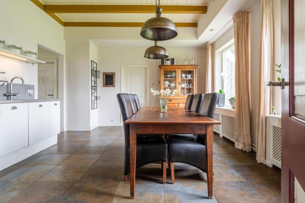 Het gaat hier om een klassieke Drentse herenboerderij met (oorspronkelijk) dubbel voorhuis, inpandige deel en grote vrijstaande schuur op riant perceel. Door de samenvoeging van de twee voorhuizen zijn ruime stijlvolle kamers gecreëerd met een verzorgd afwerkingsniveau en een charmante uitstraling. De houten vloer, het balkenplafond en de hardstenen schouw promoveren de woonkamer tot stijlkamer. De keuken en eetkamer zijn voorzien van natuurstenen vloeren met een warme uitstraling, die ook letterlijk voelbaar is door de vloerverwarming. De bovenverdieping is zo’n 20 jaar geleden gerenoveerd en geïsoleerd en beschikt over wederom ruime kamers. Door de indeling van de begane grond verdient de woning het predicaat levensloopbestendig.