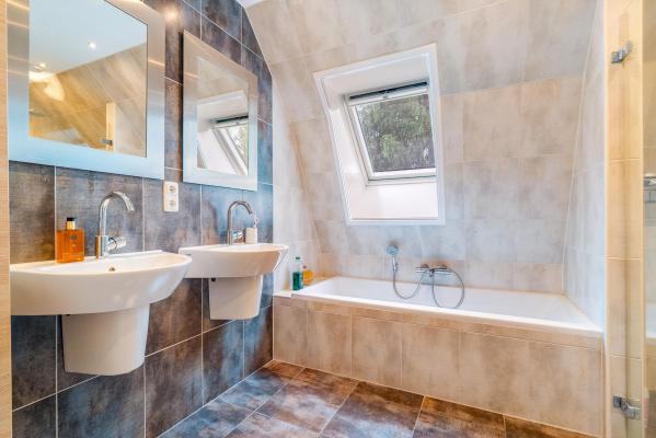 Overloop, 6 slaapkamers waarvan de master bedroom voorzien van airconditioning, badkamer met douche, ligbad en dubbele wastafel, separaat toilet.