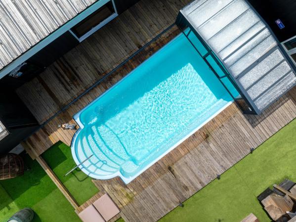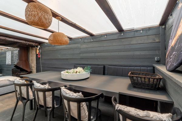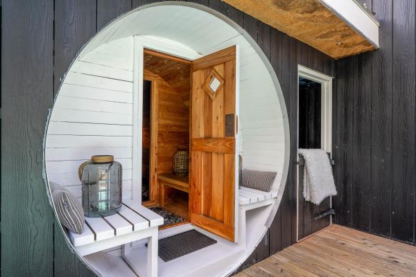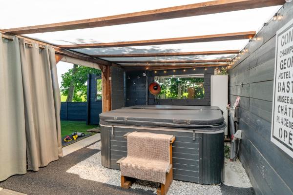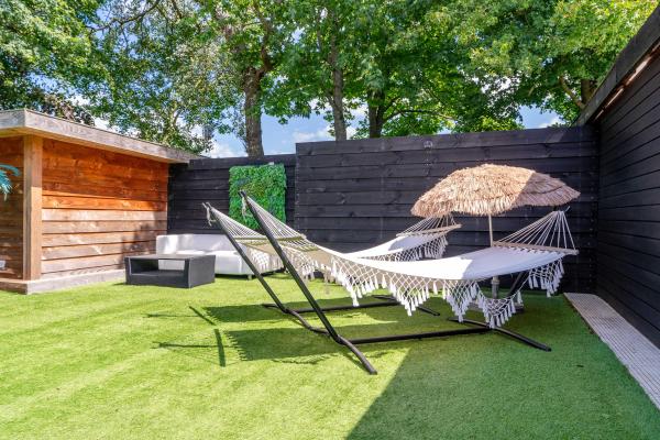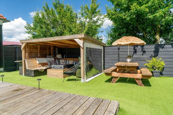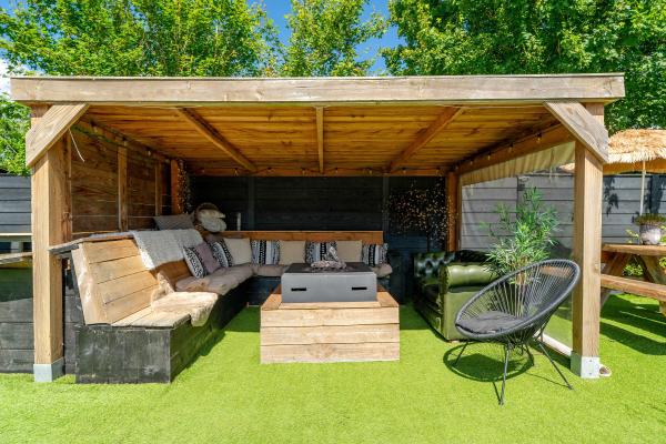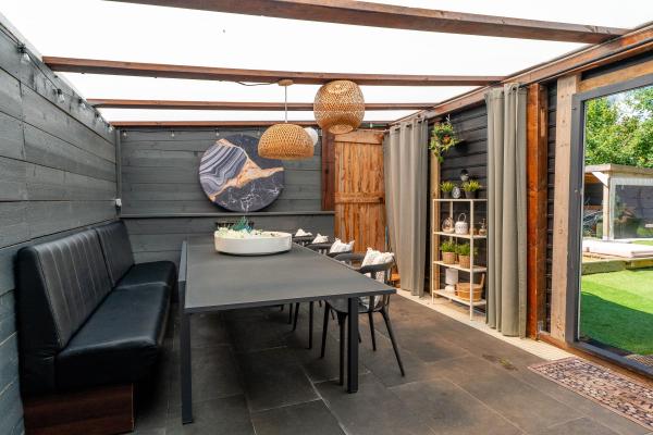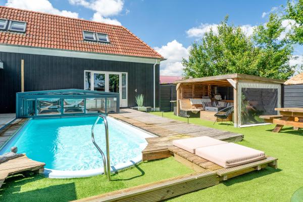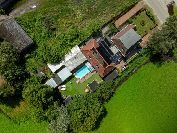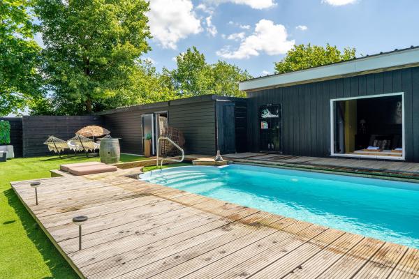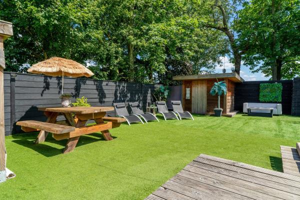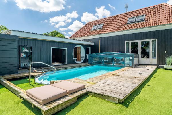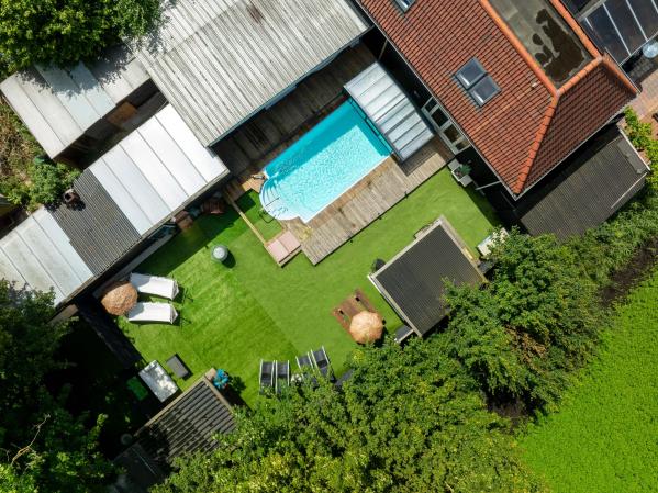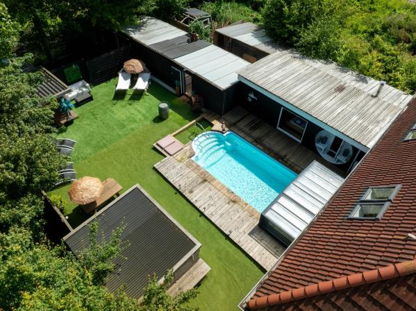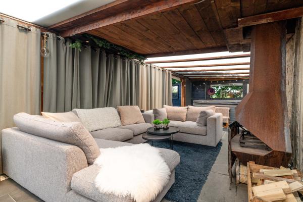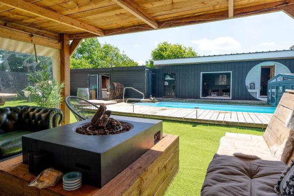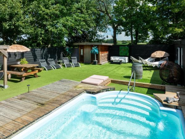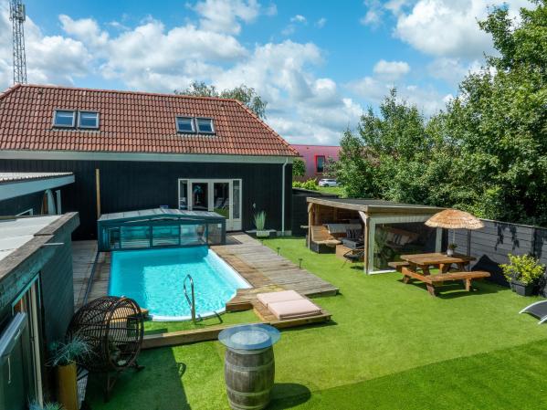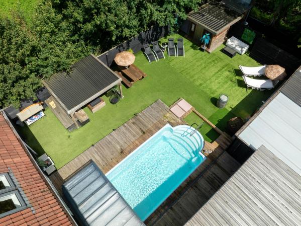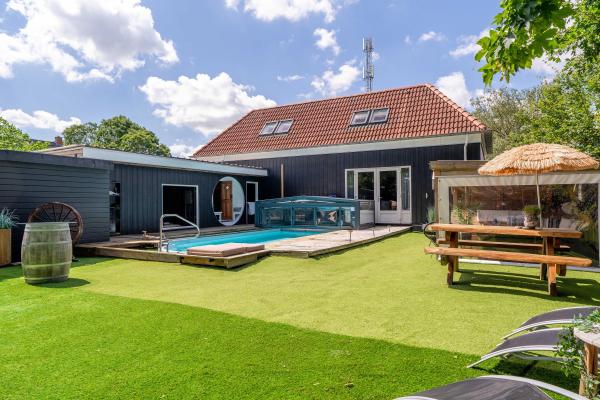 Buiten bevindt zich een riante verlichte tuin met doorkijkjes over de achtergelegen landerijen. Hier bevindt zich het overdekte zwembad alsmede meerdere relaxruimtes. De buitenruimte biedt onder andere nog een overdekt terras met jacuzzi, een Barrel (houtkachel voor 8 personen).