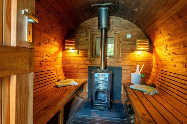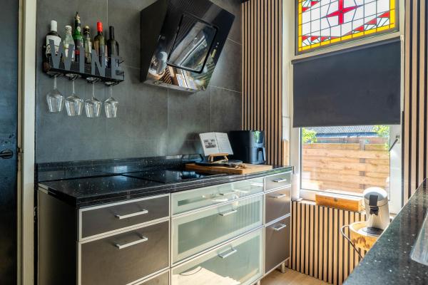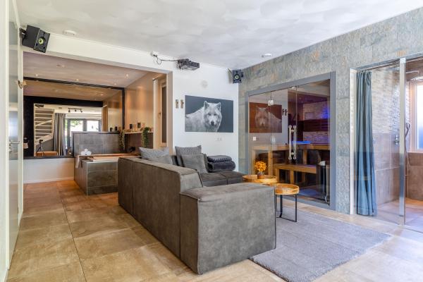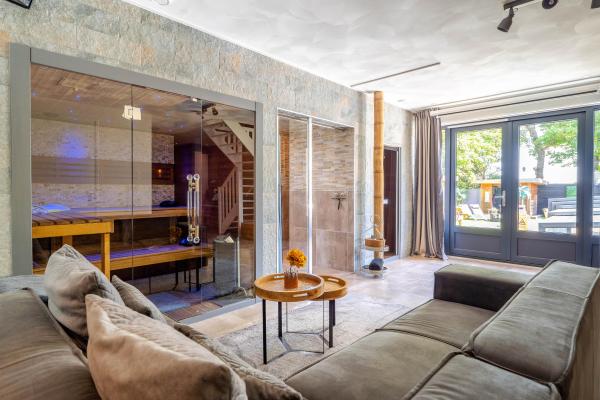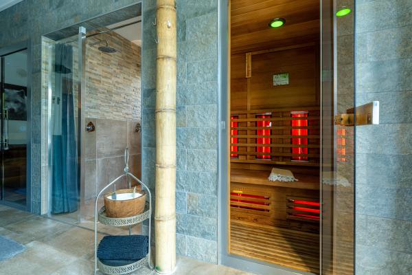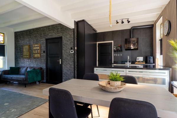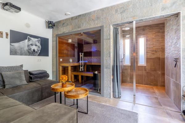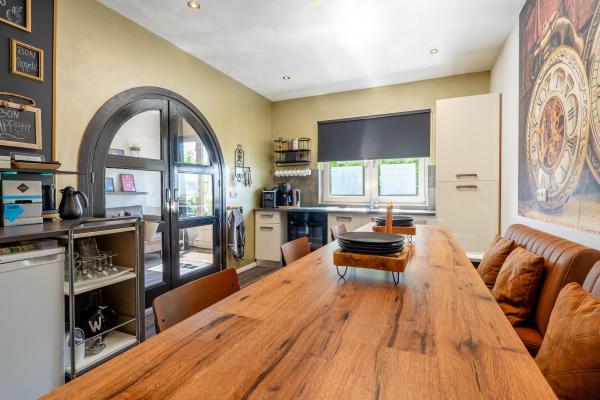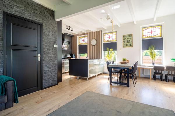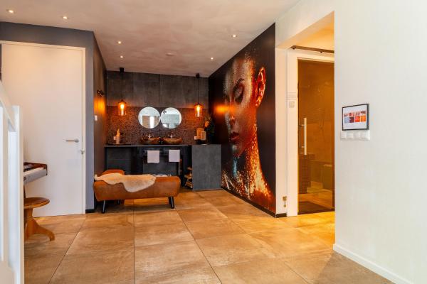 Via de oprit komt men via de eigen entree in een volwaardige keuken, waarnaast de ontbijtruimte voor B&B gasten is gesitueerd. Van hieruit bereikt u de sfeervol ingerichte wellness met Hamam/stoomruimte met douche en wastafels. Voorts bevindt zich in de centrale ruimte nog een riante wasruimte met design waskommen, waarnaast de kachelsauna, dubbele douche, infraroodsauna en bubbelbad zijn gesitueerd. In het midden bevindt zich een royale zit/ontspanningsgedeelte met beamer en groot scherm. De verdieping van de wellness biedt 2 riante slaapkamers voor B&B gasten.
