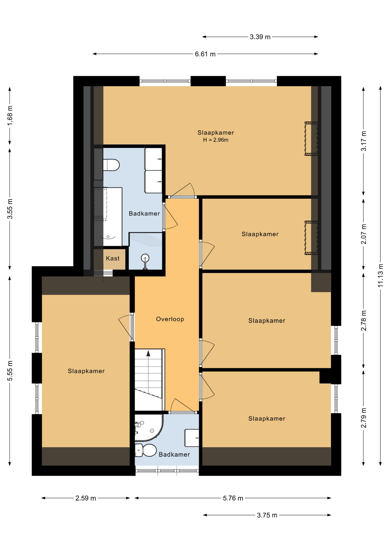Overloop, 5 slaapkamers, moderne badkamer met douche, ligbad, dubbele wastafel, nette 2e badkamer met douche, wastafel en toilet.