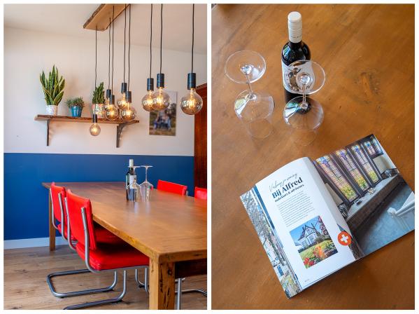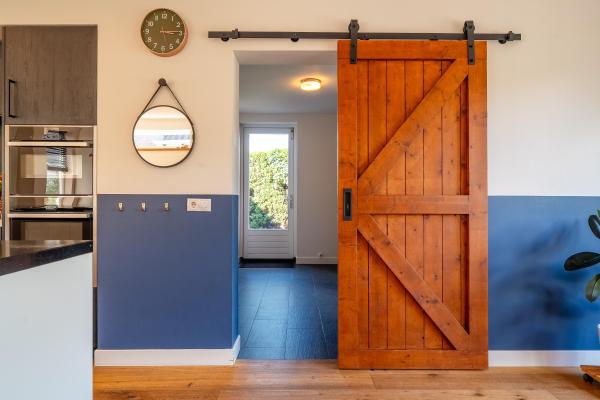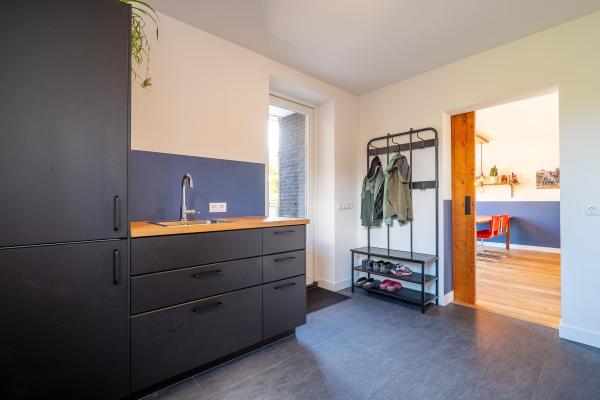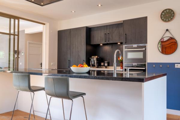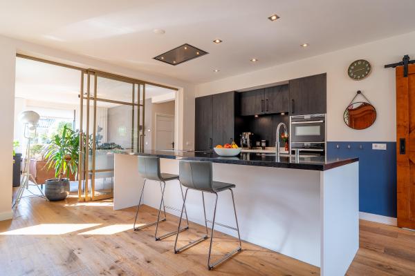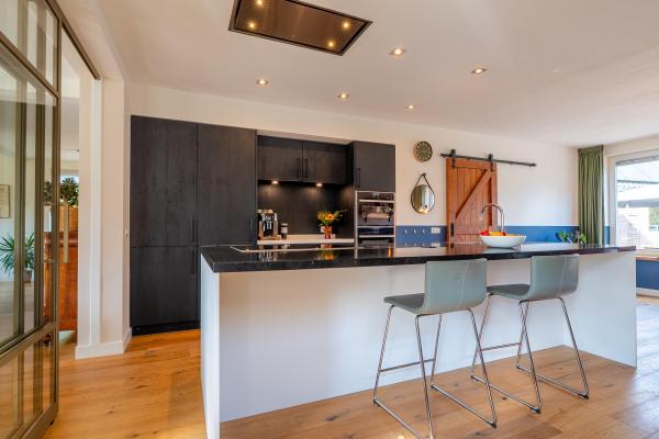 Entree/hal met trapopgang, ruime U-vormige living met houtkachel, luxe open keuken voorzien van kookeiland en diverse inbouwapparatuur,
