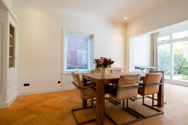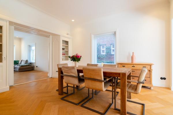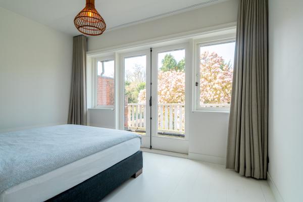 Bij binnenkomst ervaart u direct de warme en uitnodigende sfeer. De royale hal vormt het centrale punt van de woning en geeft toegang tot de verschillende leefruimtes. De woonkamer aan de voorzijde kenmerkt zich door een fraaie lichtinval en een prettige plafondhoogte, wat zorgt voor een ruimtelijk gevoel. Via en suite deuren bereikt u de eetkamer, waar u in alle rust kunt dineren met uitzicht op de tuin. De luxe keuken is uitgevoerd in een stijlvolle donkere kleurstelling en voorzien van diverse inbouwapparatuur. Aansluitend bevindt zich de serre, een heerlijke plek waar binnen en buiten naadloos in elkaar overlopen. Grote raampartijen bieden hier een prachtig zicht op de groene tuin en zorgen voor een overvloed aan daglicht. Tevens beschikt de begane grond over een praktische bijkeuken, een toilet en een slaapkamer, ideaal voor gelijkvloers wonen of als werkruimte. Op de eerste verdieping treft u 4 slaapkamers, waarvan enkele met directe toegang tot het balkon. De kamers zijn ruim van opzet en beschikken over vaste kasten. De badkamer is modern en luxe uitgevoerd met een vrijstaand ligbad, een douche en een dubbele wastafel. Daarnaast is er een separaat toilet op deze verdieping. De tweede verdieping biedt nog eens 4 slaapkamers, wat het totaal op 8 slaapkamers brengt. Deze verdieping is uitermate geschikt voor grotere gezinnen of voor het combineren van wonen en werken. Dankzij de indeling en het daglicht zijn ook deze ruimtes zeer comfortabel in gebruik. In de kelder bevindt zich extra bergruimte, ideaal voor opslag of als provisieruimte. De woning wordt omgeven door een verrassende diepe tuin op een perceel van 820 m². Hier geniet u van optimale privacy en een groene omgeving. Achter op het perceel bevindt zich een ruime garage, geschikt voor meerdere doeleinden.