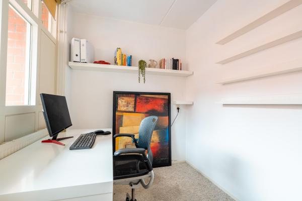 Het appartement bevindt zich op de eerste verdieping en heeft een prettige en praktische indeling. Via de hal komt u binnen in de ruime woonkamer met halfopen keuken, waardoor de leefruimte open en licht aanvoelt. Aangrenzend ligt een extra kamer die momenteel als werkkamer wordt gebruikt, maar ook uitstekend geschikt is als hobbyruimte of logeerkamer. Vanuit deze kamer heeft u direct toegang tot het balkon. Verder beschikt het appartement over een slaapkamer en een badkamer. Het balkon is gunstig op het zuiden gelegen, zodat u hier volop van de zon kunt genieten. Bij het appartement hoort een eigen fietsenberging van ca. 5 m² op de begane grond. Het complex is degelijk gebouwd, goed onderhouden en onderdeel van een actieve en gezonde Vereniging van Eigenaren, wat bijdraagt aan een prettig en zorgeloos woongevoel.
