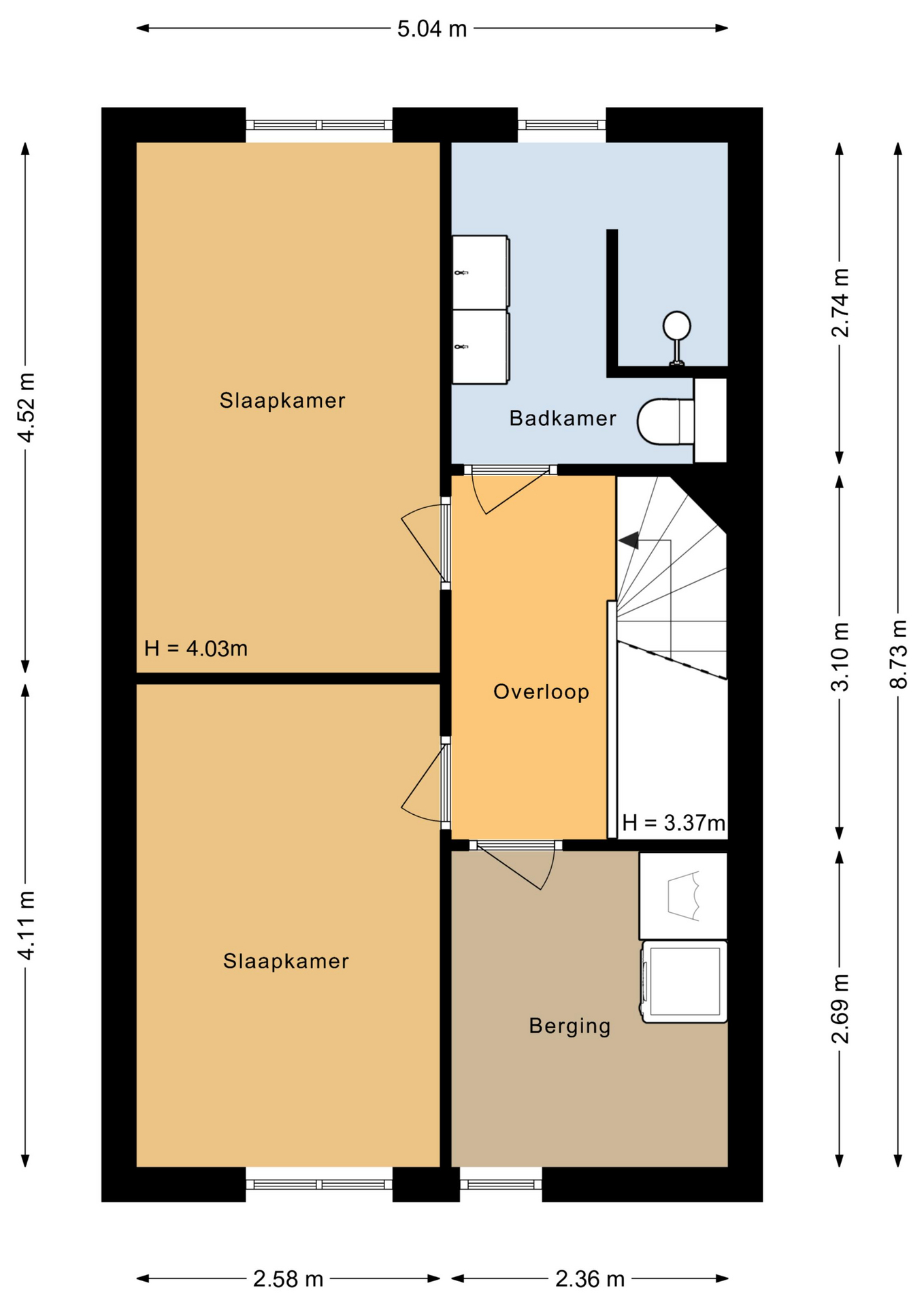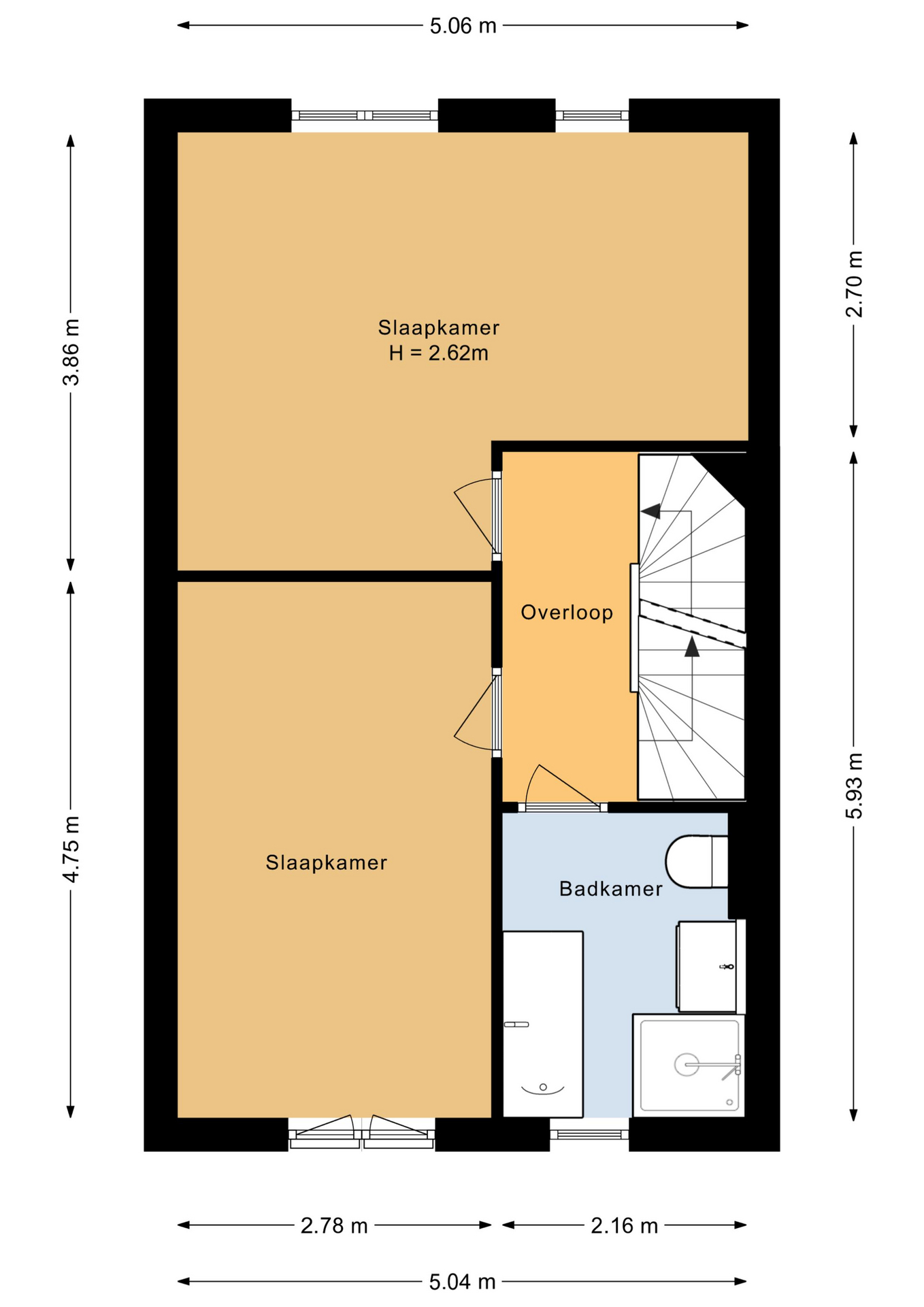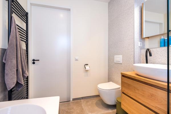 Overloop, 2 slaapkamers, moderne badkamer met douche, ligbad, wastafel en toilet.