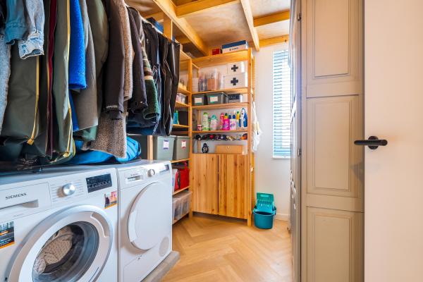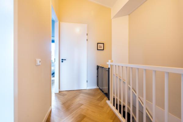 Overloop, 2 slaapkamers, 2e moderne badkamer met inloopdouche, dubbele wastafel en toilet, wasruimte met vliering.