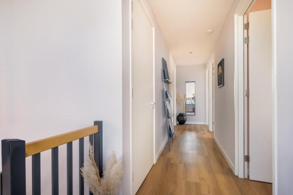 Overloop, 4 slaapkamers, waarvan de master bedroom met walk-in-closet, moderne badkamer met inloopdouche, wastafelmeubel met 2 kranen en wandcloset.