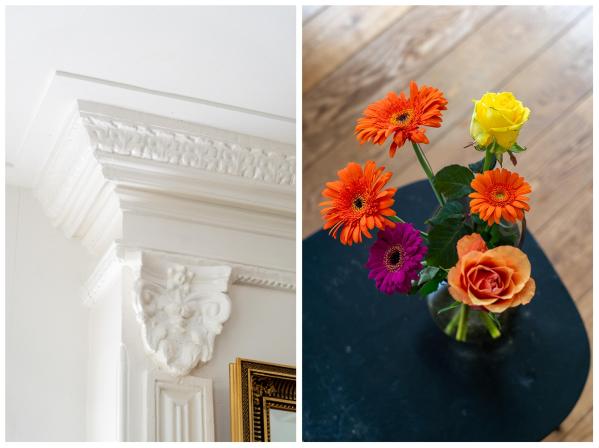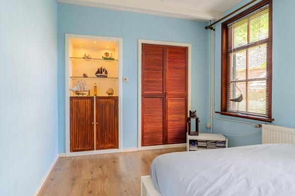 Vanuit de hal leidt een trapopgang naar de tussenverdieping (de 1e verdieping boven het achterhuis) alwaar zich de master bedroom bevindt. Deze zeer riante kamer meet circa 7 m x 7,5 meter en heeft een plafondhoogte van 3,25. De kamer heeft een eigen toilet met dubbele wastafel, riante kastenwand en kan eventueel gesplitst worden in meerdere slaapkamers indien u dit wenst. Op de verdieping boven het voorhuis bevinden zich nog 2 slaapkamers waarvan 1 een grote inloopkast heeft.