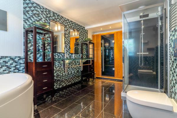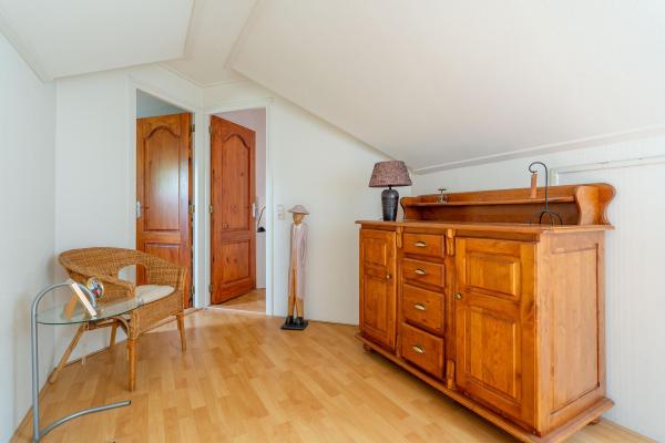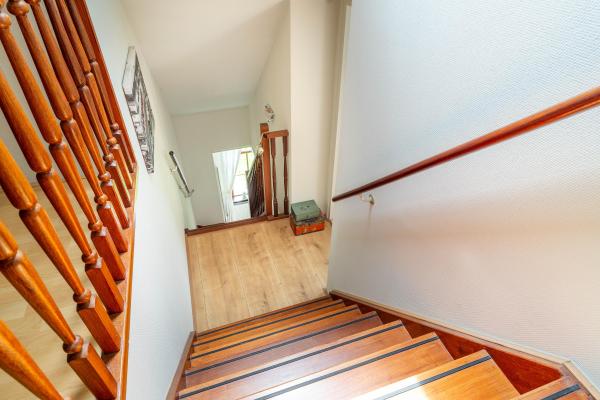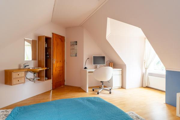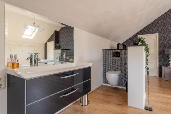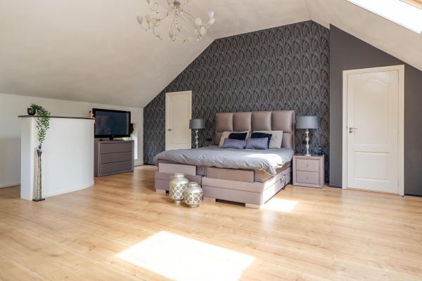 Overloop, master bedroom van 7 m * 7,5 m met eigen toilet, dubbele wastafel en kastenwand. Toegang tot de stookruimte alwaar zich de CV bevindt.