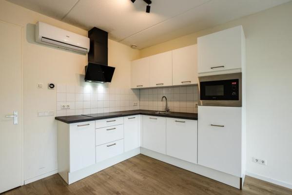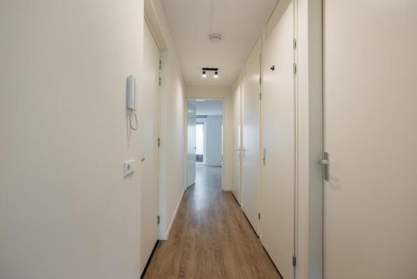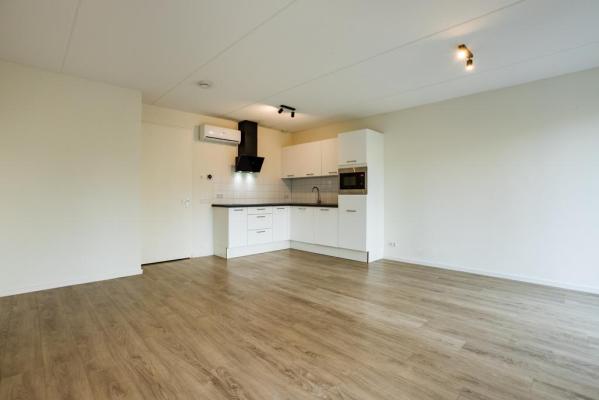 Entree/hal, wandcloset met fonteintje, woonkamer met nette open keuken voorzien van diverse inbouwapparatuur, riante slaapkamer, moderne badkamer met douche en dubbele wastafel, technische ruimte met witgoedaansluiting
