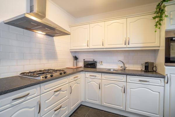 Overloop, toilet, L-vormige woonkamer met halfopen keuken (samen groot circa 45 m²), bijkeuken met toegang tot een ruim dakterras van circa 22 m². De keuken is voorzien van een inbouw gaskookplaat, vaatwasmachine, afzuigkap, oven en koelkast.