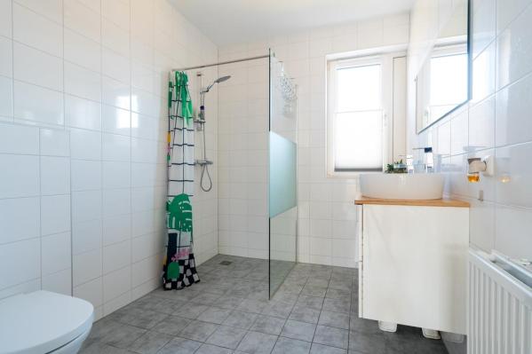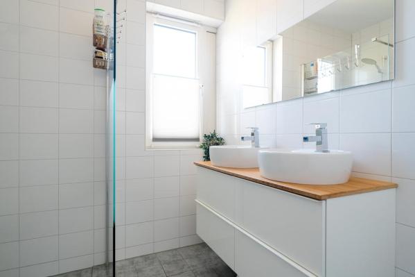 Overloop, 3 slaapkamers, nette badkamer met douche, dubbele wastafel en toilet.