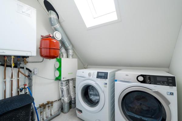 Overloop, wasruimte met cv-opstelling, ruime multifunctionele kamer en vliering.