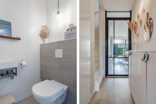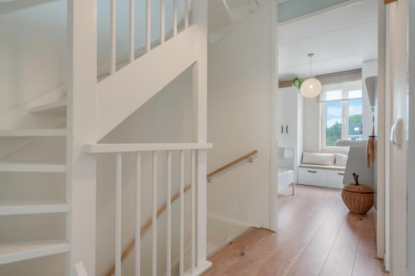 Entree/hal met trapopgang, wandcloset met fonteintje, tuingerichte living met eikenhouten vloer, schuifpui, trapkast en een luxe open keuken voorzien van diverse inbouwapparatuur.