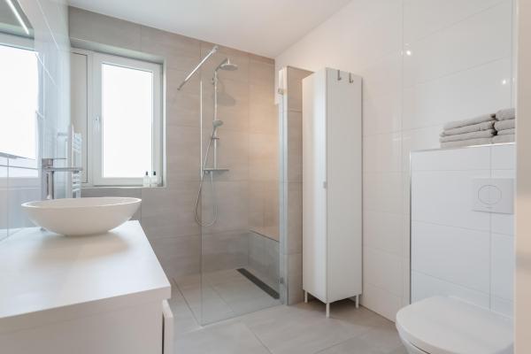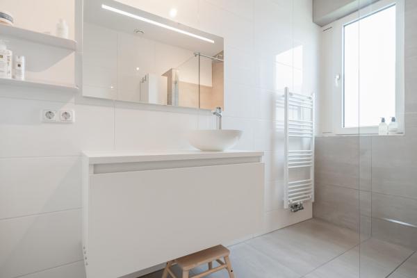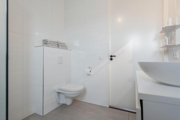 Overloop, 3 slaapkamers, waarvan één met vaste kasten, moderne badkamer met inloopdouche, wastafelmeubel en een 2e toilet.