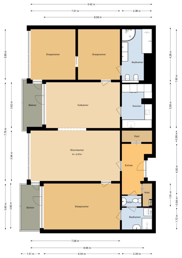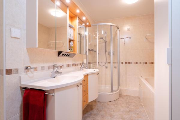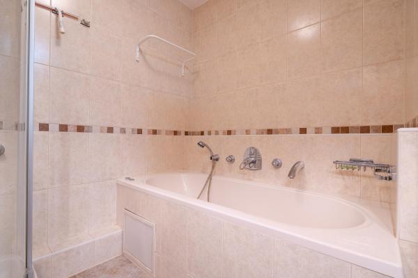 Entree/hal, wandcloset met fonteintje, kastruimte, woonkamer, eetkamer, 2 slaapkamers, nette badkamer met douche, ligbad, dubbele wastafel, toilet en bidet, 2e badkamer met douche, wastafel en witgoedaansluiting.