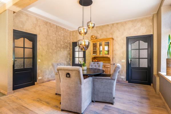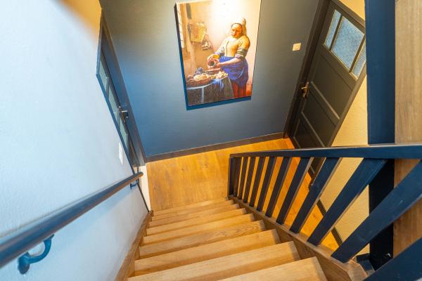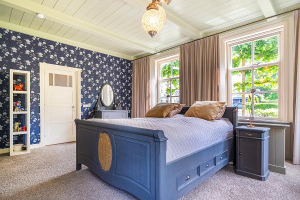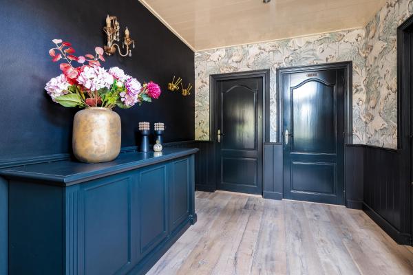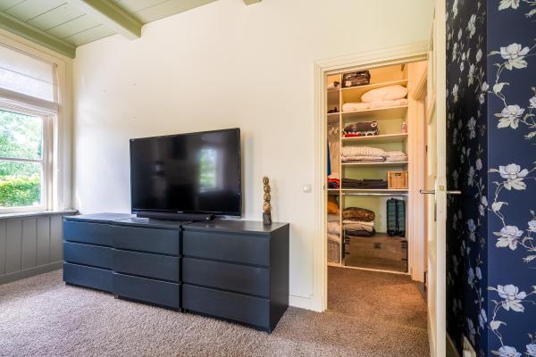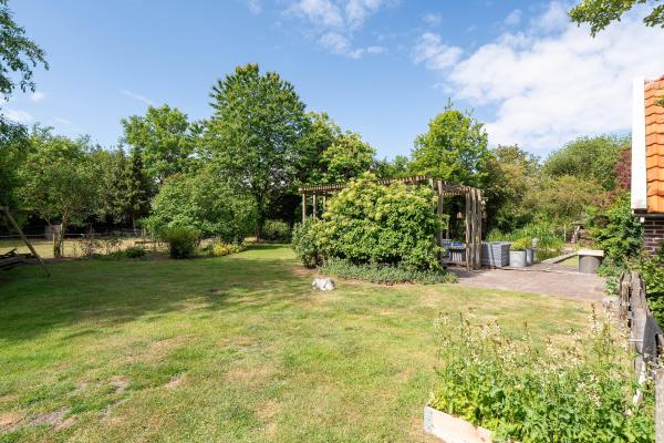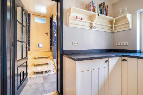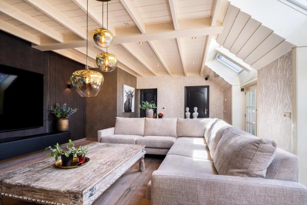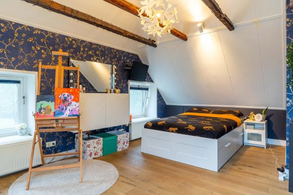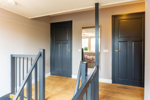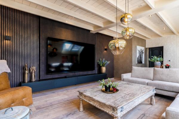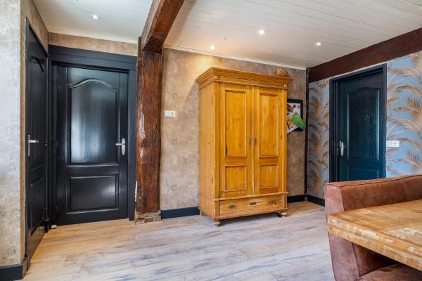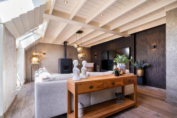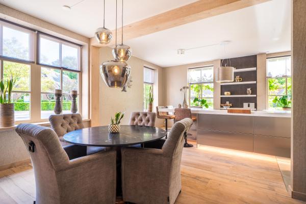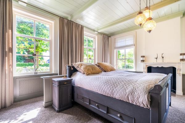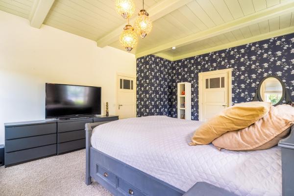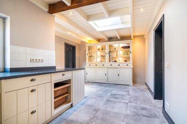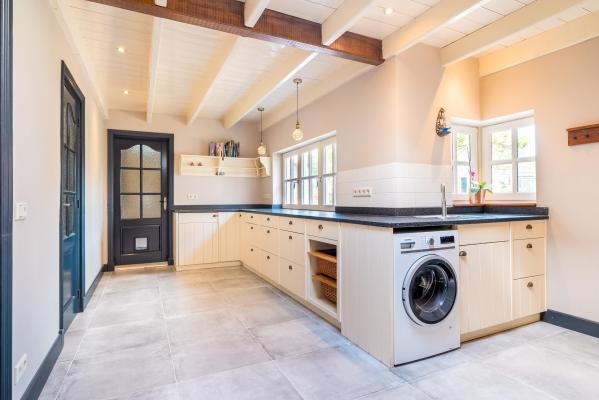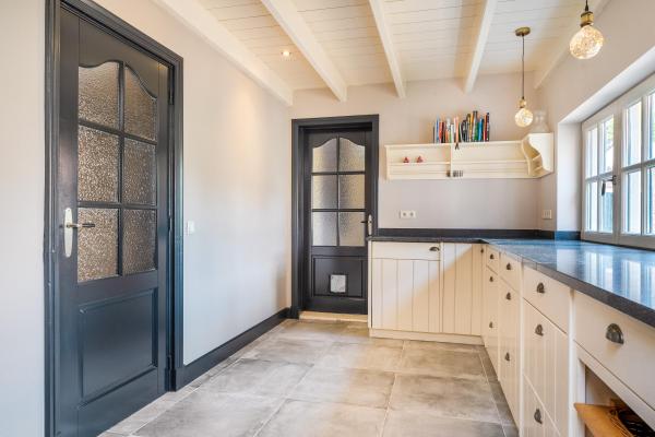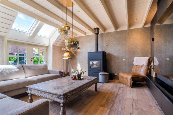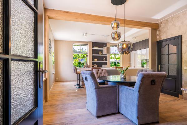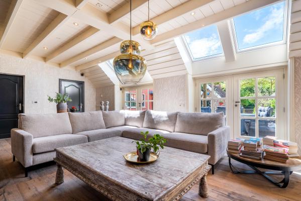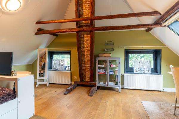 In het voorhuis bevindt zich de Italiaanse design woonkeuken (2024) van ca. 37 m2 met alle wenselijke inbouwapparatuur (Gaggenau). De ruimte biedt ruimte aan een grote eettafel en dient als centrale spil in het huis waarbij u door de vele raampartijen zicht heeft op wat er zich aan de voorkant van de boerderij afspeelt. Ook is in het voorhuis de master bedroom gesitueerd, voorzien van vloerverwarming, grote inloopkast en moderne badkamer met wastafelmeubel, toilet en inloop douche. Vanuit de halpartij is de woonkamer in het achterhuis te bereiken met een woonoppervlak van ca. 40 vierkante meter. Deze ruimte is intiem en heeft meerdere openslaande deuren naar de achtertuin waardoor ’s zomers een gezellige binnen-buiten beleving wordt ervaren.