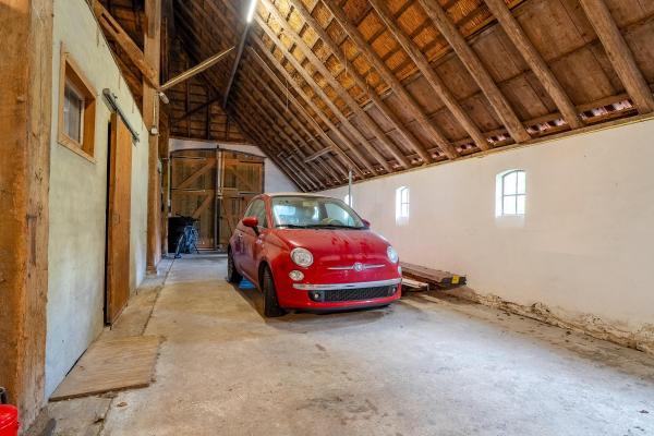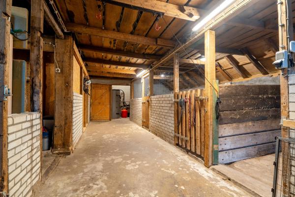 Zeer ruime rietgedekte schuur met stallen en grote baanderdeuren