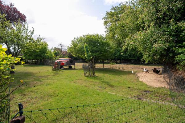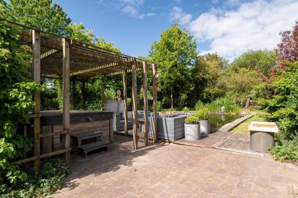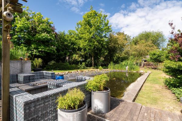 De parkachtige besloten tuin heeft een meerdere terrassen en een vijver. Op een afgeschermd gedeelte van het terras bij het gastenverblijf is een jacuzzi opgesteld. Aansluitend aan de tuin is een boomgaard met diverse fruitbomen.