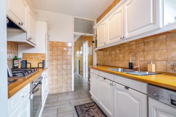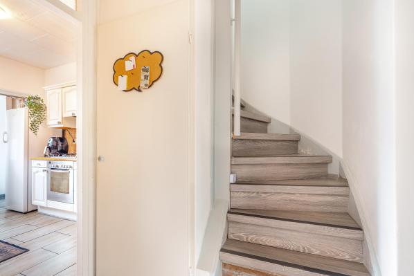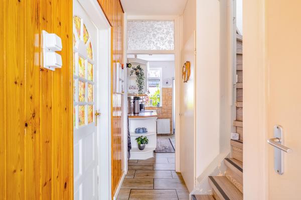 Entree/hal met trapopgang, toilet met fonteintje, trapkast, doorzon woonkamer, dichte keuken voorzien van enige inbouwapparatuur, bijkeuken met witgoedaansluiting.