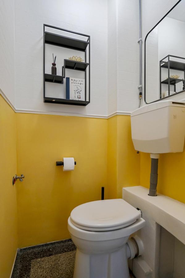 Overloop, toilet, sfeervolle L-vormige woonkamer met erker en voorzien van een houten vloer, glas-in-lood ramen en hoge en authentieke plafonds.