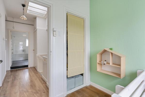 Overloop met lichtkoepel, diverse vaste kastruimte, drie slaapkamers van resp. circa 13, 10 en 5 m2, nette badkamer met wasmeubel, douche, ligbad en tweede toilet, praktische wasruimte met veel bergruimte en cv ketel.