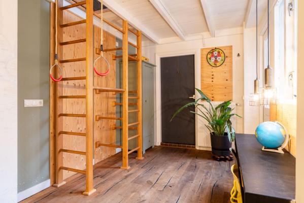 Entree/ruime hal met trapopgang, toilet met fonteintje, sfeervolle living voorzien van een hoog plafond en moderne open keuken voorzien van kookeiland en diverse inbouwapparatuur, leuke speelhoek met klimtoestel en met toegang naar de tuin, kast met cv opstelling.