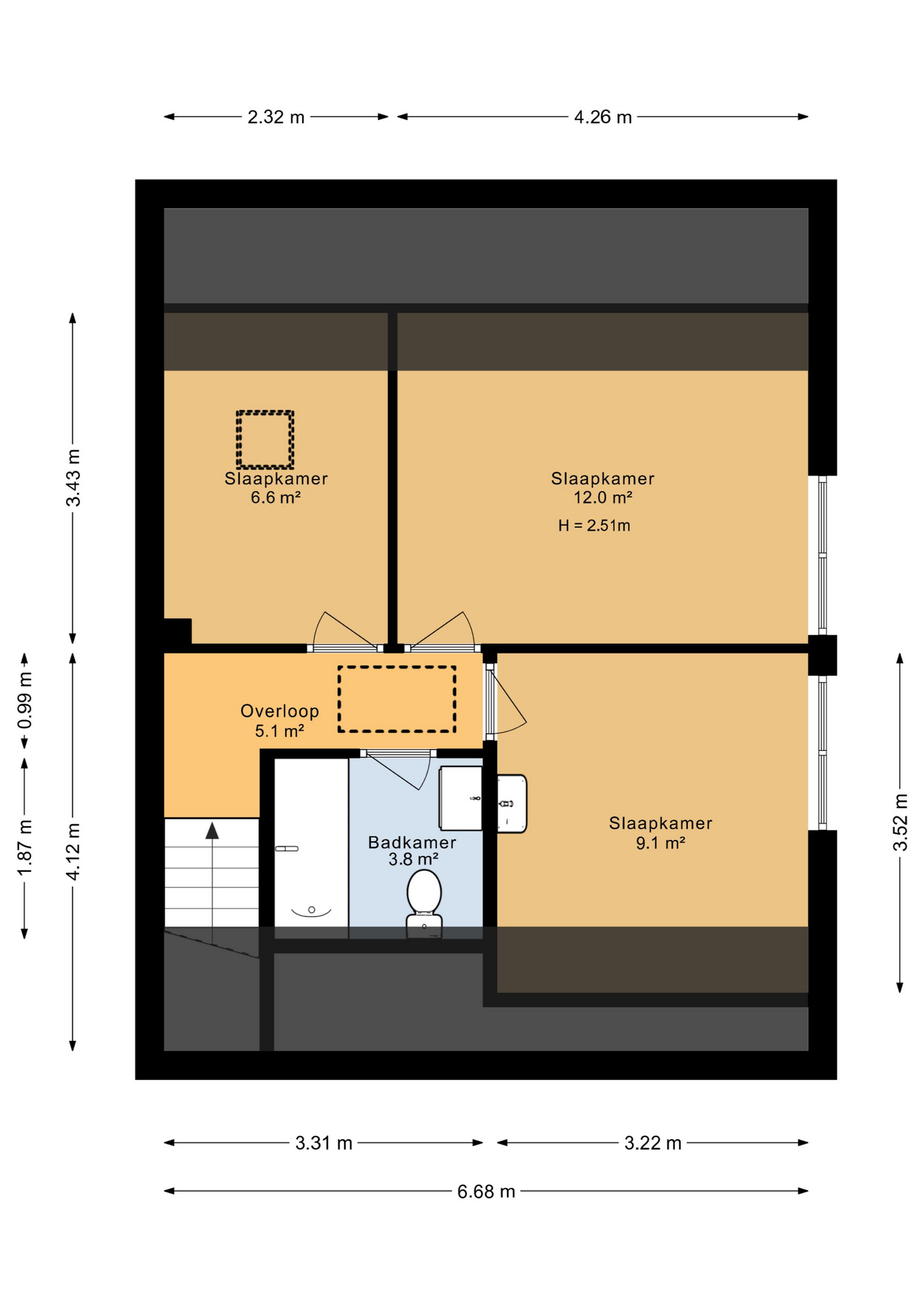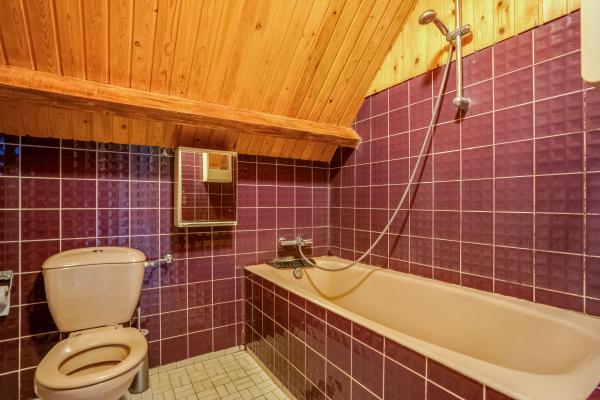 Overloop, 3 slaapkamers, badkamer met ligbad/douche, wastafel en toilet.