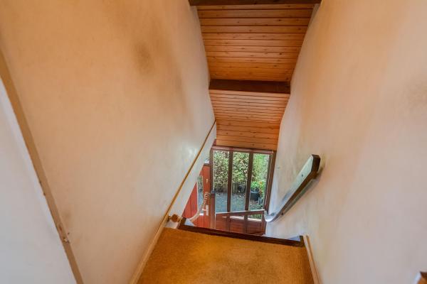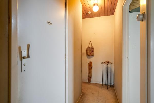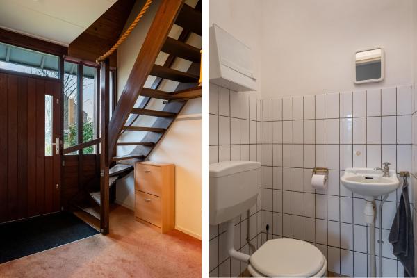 Entree/hal met trapopgang, toilet met fonteintje, doorzon woonkamer, dichte keuken met toegang tot de tuin.