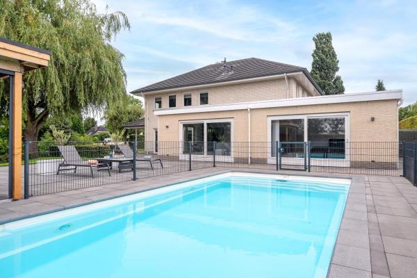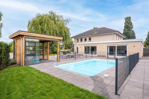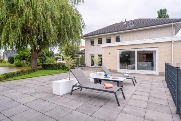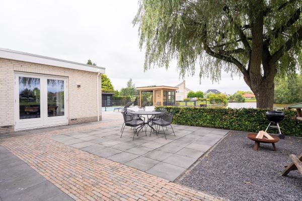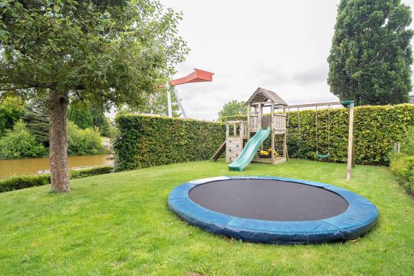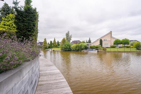 De tuin is een waar genoegen voor liefhebbers van het buitenleven: een zwembad met zonnige ligging, verwarmd via een energiezuinige warmtepomp, een stijlvolle houten overkapping om het hele jaar door buiten te kunnen zitten, meerdere terrassen, een eigen speelplek voor kinderen en een aanlegsteiger.
