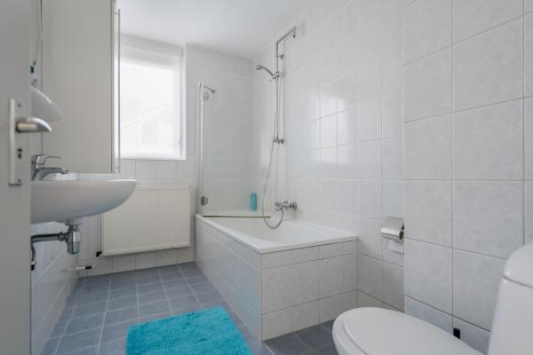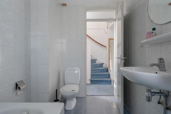Overloop, 3 slaapkamers, waarvan 2 met inbouwkasten, badkamer met ligbad/douche, wastafel en toilet.